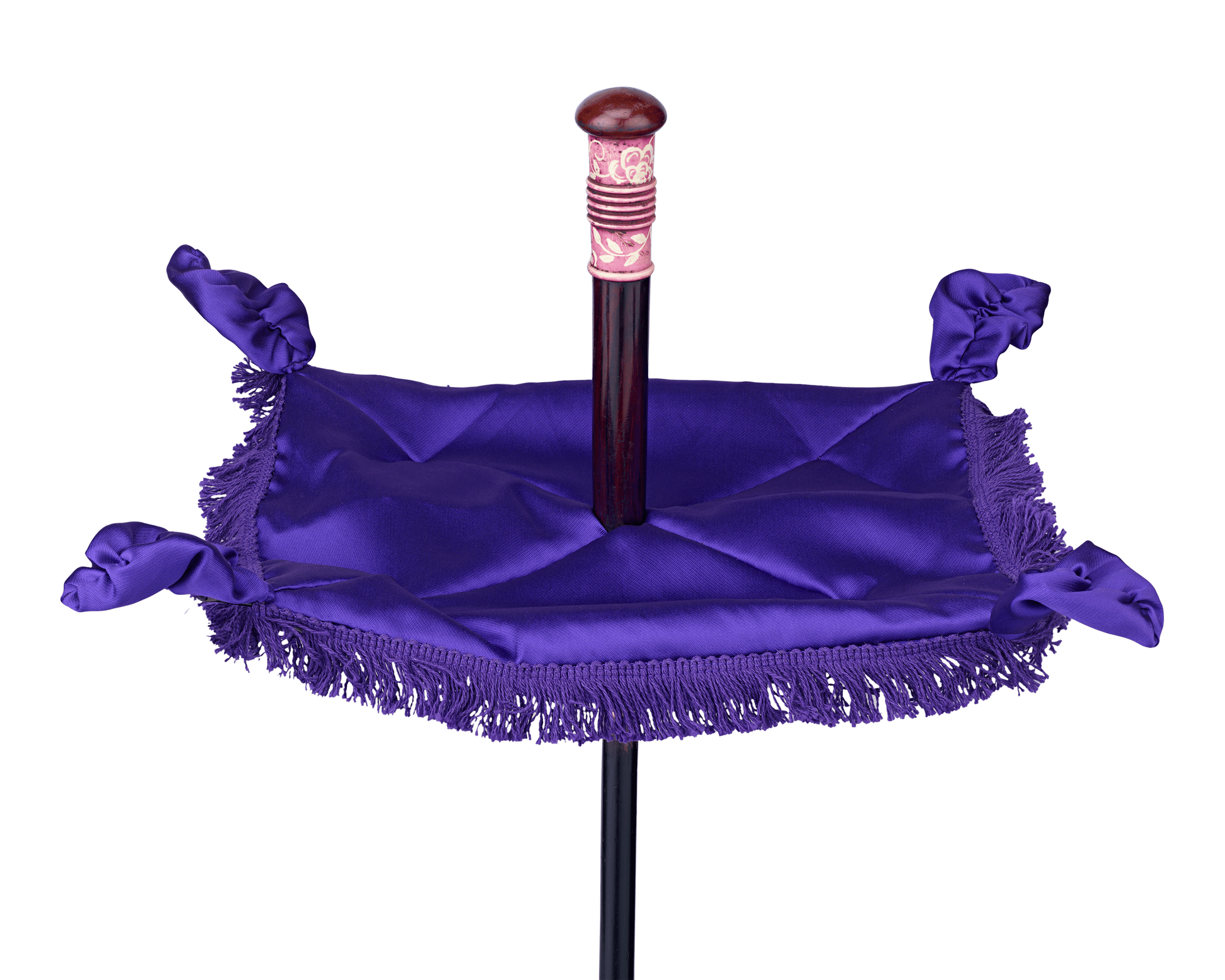 The incredible craftsmanship and ingenuity of this antique magician’s cane is no illusion. The theatrical cane extends at the top and bottom to transform into a table covered in purple fabric. Set up street-side next to a performing magician, the table allows one to collect tips for one's tricks.