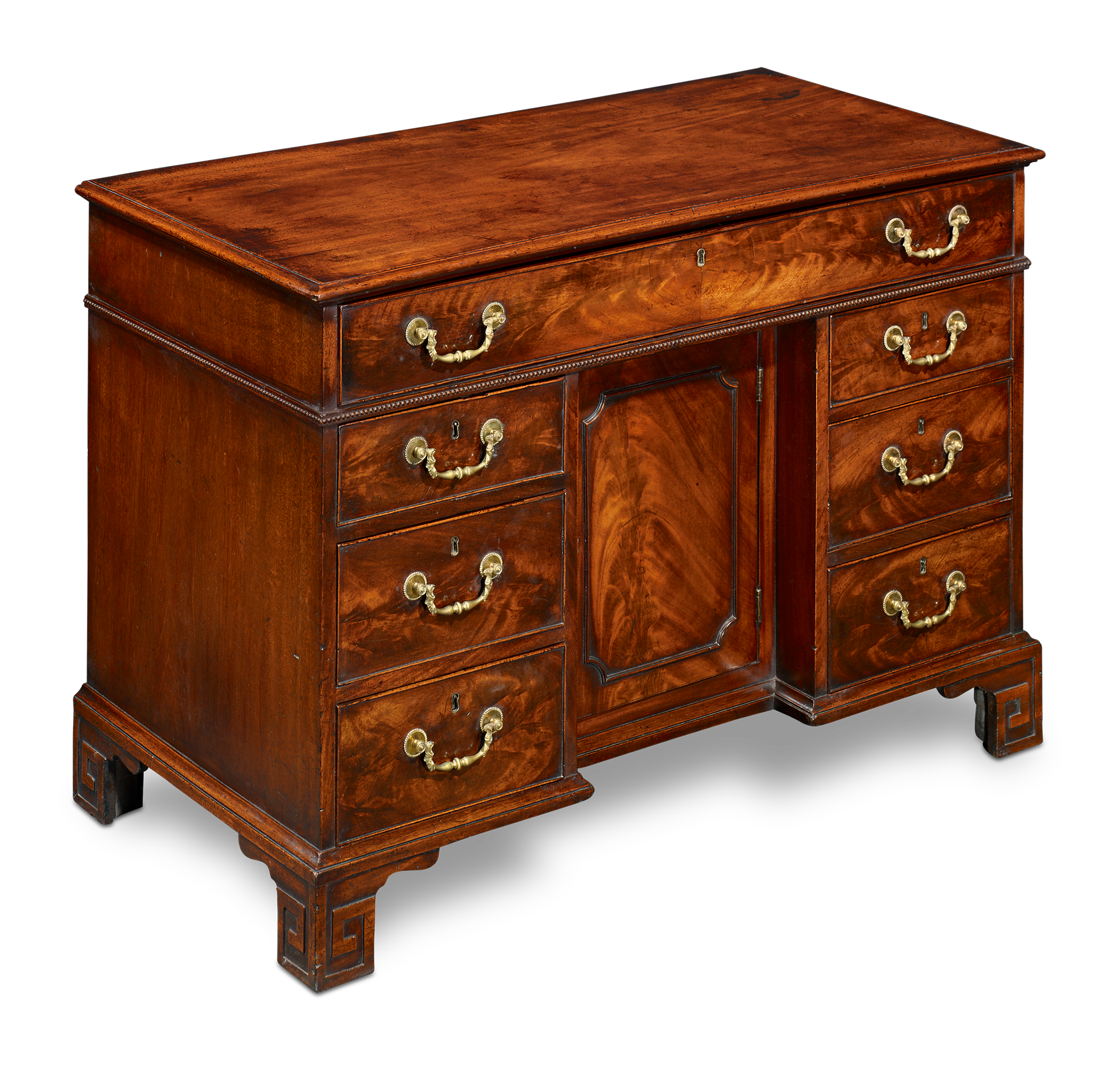 Chippendale’s meticulous approach to construction is evident throughout. A finely carved band of narrow guilloche beading runs beneath the upper drawer, a hallmark of his refined ornamental style. The original fire-gilded buckle drop handles remain intact and contribute to the desk’s distinguished presence. The bracket feet are carved with a pronounced key motif, another detail associated with Chippendale's signature hand. Underneath, the red wash typical of his workshop and laminated oak corner blocks reinforce its authenticity.