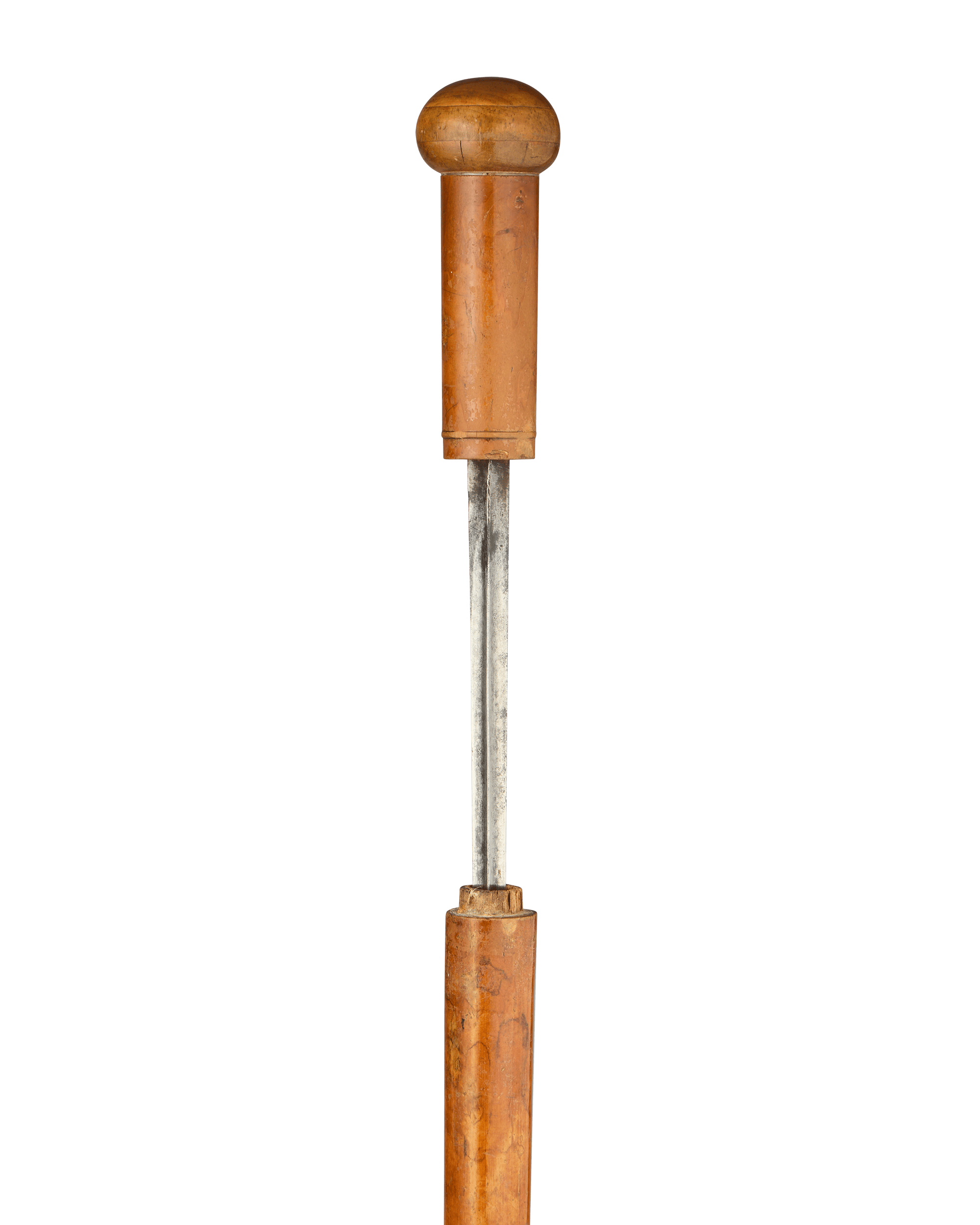 Concealed within this handsome Malacca shaft lies a deadly secret. With a pull of the knob, a long, three-sided blade emerges from within the weapon cane. Known as an assassin’s cane, the blade is designed for thrusting, capable of inflicting a wound that is exceptionally difficult to treat.