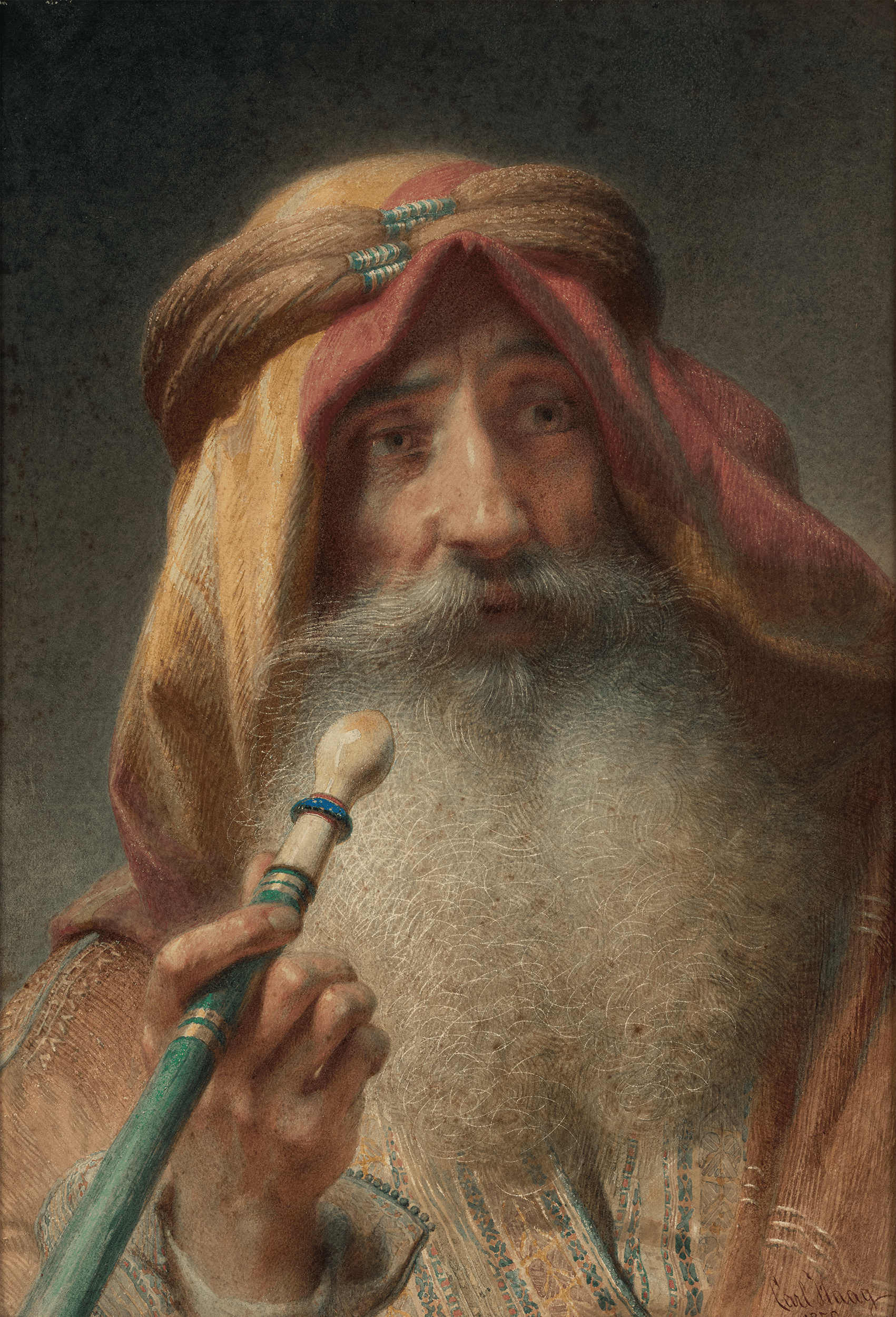 The composition centers on a male figure dressed in traditional Middle Eastern attire, rendered with striking presence. His calm expression and distant gaze convey introspection, while the soft modeling of the face demonstrates Haag’s refined understanding of anatomy and character. A vivid green hookah held delicately in his hand introduces a moment of chromatic contrast against the muted earth tones of the palette. Heightened with white and subtly scratched to create texture, the surface shimmers with delicate detail.