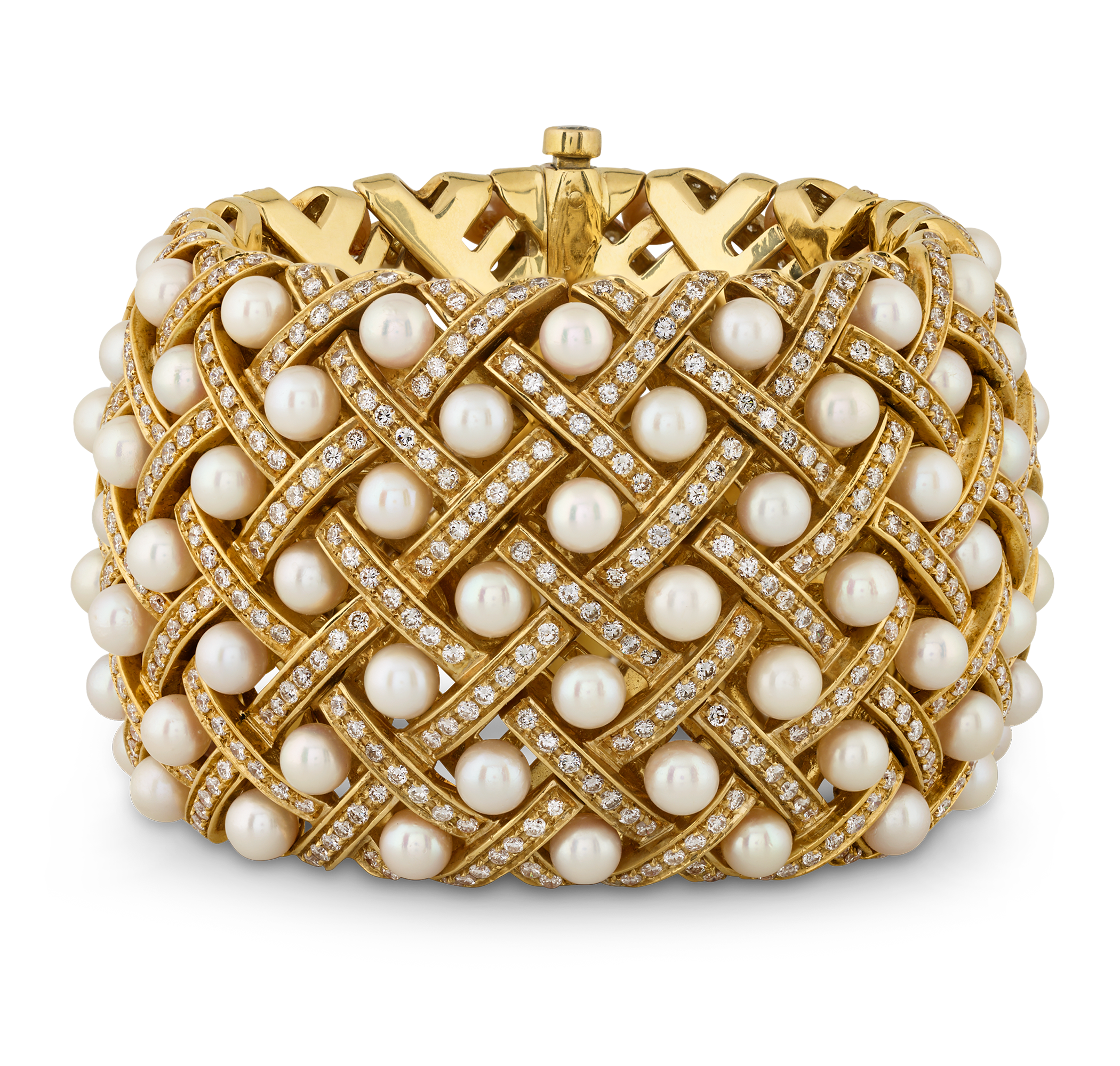 - The luminous pearls are nestled between diamond-encrusted 18K yellow gold latticework