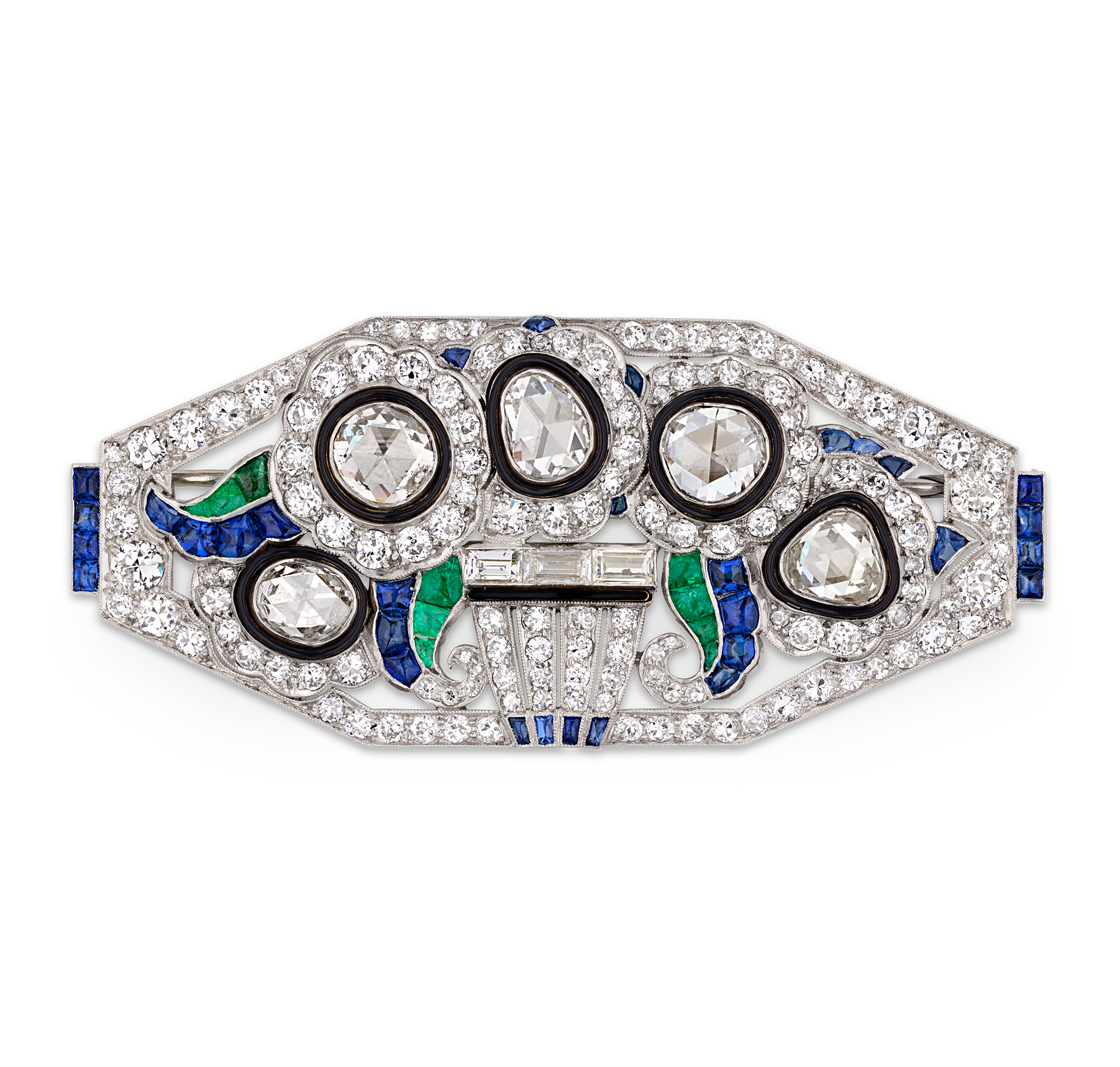 - The Art Deco design sparkles with diamonds, emeralds and sapphires