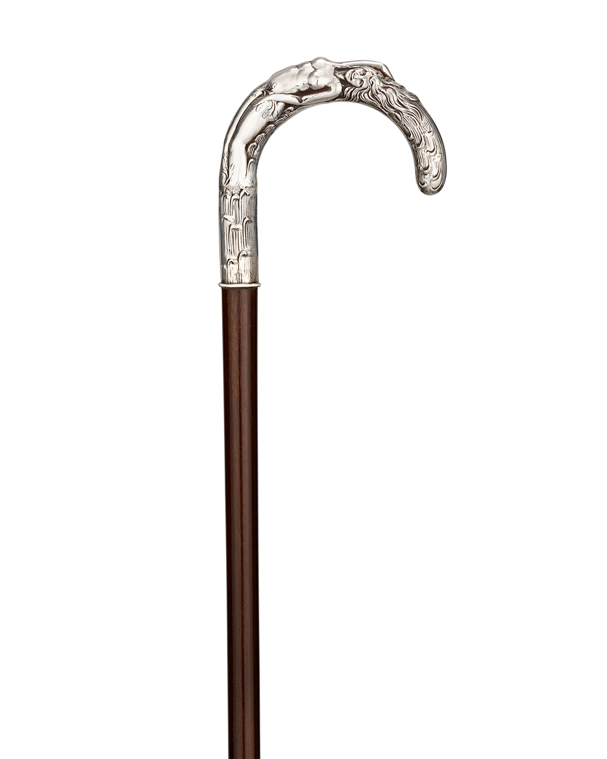 Exquisite in both form and detail, this decorative crutch cane features a silver handle shaped as a sensuous mermaid. Her swirling locks echo a rolling wave motif, creating the impression of fluid motion. Mounted on a rich snakewood shaft, the cane exemplifies the intricate elegance and naturalistic artistry characteristic of the Art Nouveau style.