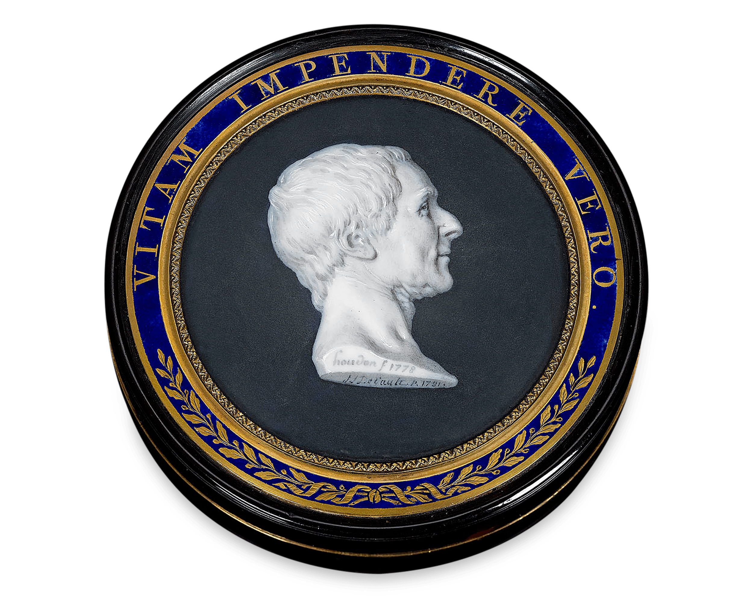 Adding to its elegance, the philosopher's portrait is set in a skillfully chased gold and glass frame and a dramatic band of cobalt enameling, over which the Latin 'VITAM IMPENDERE VERO' is inscribed. Beautifully crafted of the finest materials, this rare box would be the perfect acquisition for collectors of both decorative boxes and miniatures.