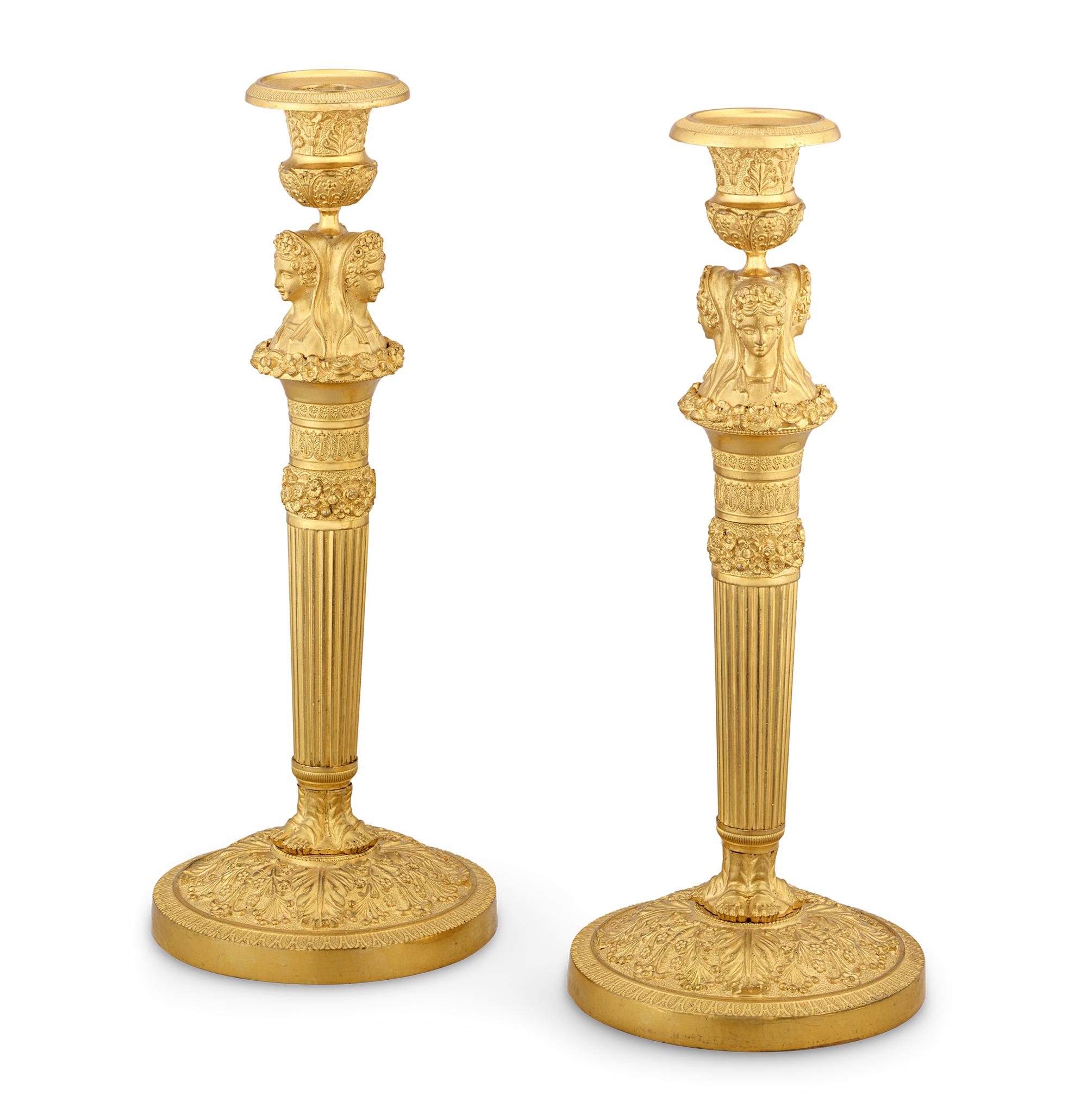 The partially fluted shafts rise gracefully, each adorned with a ring of intertwined flowers and supporting three finely modeled, draped female busts. These graceful figures rest on circular bases enriched with palmettes, foliage and a delicate frieze of water leaves. The meticulous chasing and mercury gilding create a luminous finish that catches the light beautifully.