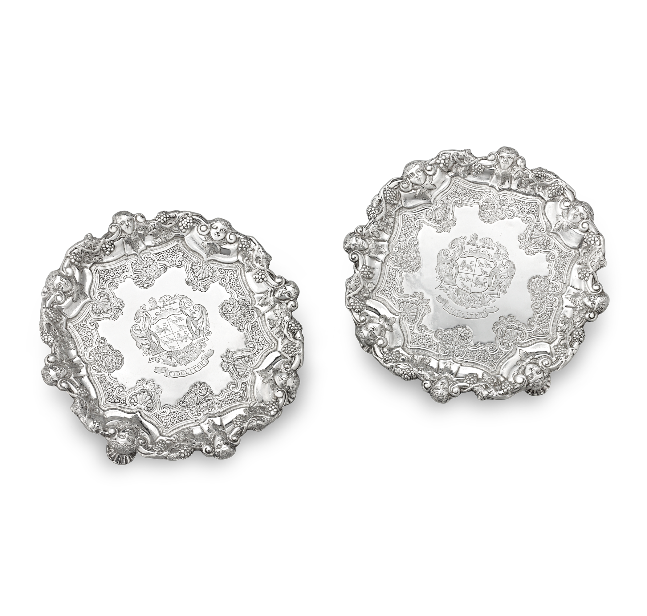- These salvers are adorned with an applied cast border featuring masks interspersed with vines and grapes