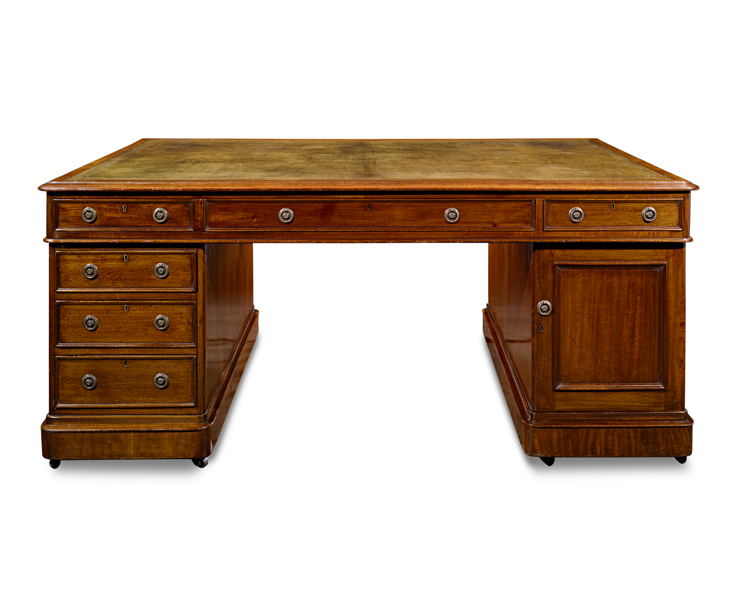 This commanding English partner’s desk, crafted in richly figured mahogany and green leather, exemplifies the authority and craftsmanship of late 19th-century British furniture. Once used by bankers at the Bank of England, it reflects both the prestige of its setting and the elevated standards of London cabinetmaking. Its symmetrical, double-sided design allows two individuals to work opposite one another, a hallmark of the partner’s desk form developed for senior banking officials.
