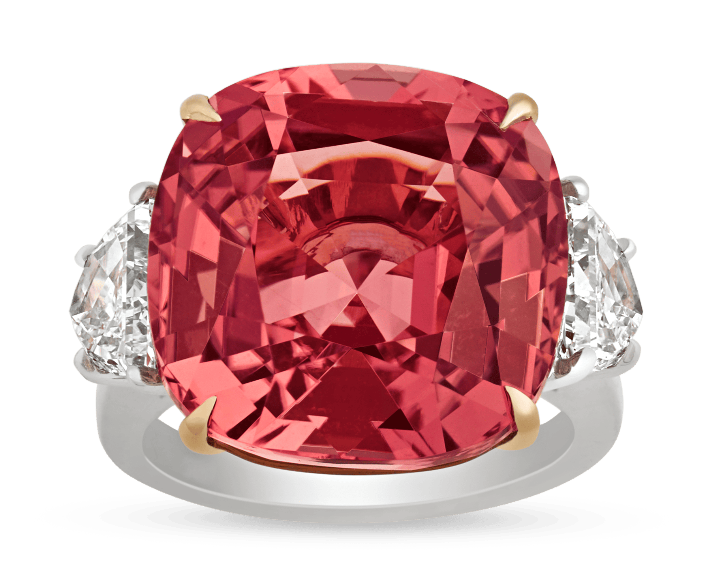 - A stunning peach tourmaline weighing 19.74 carats is at the center of this ring