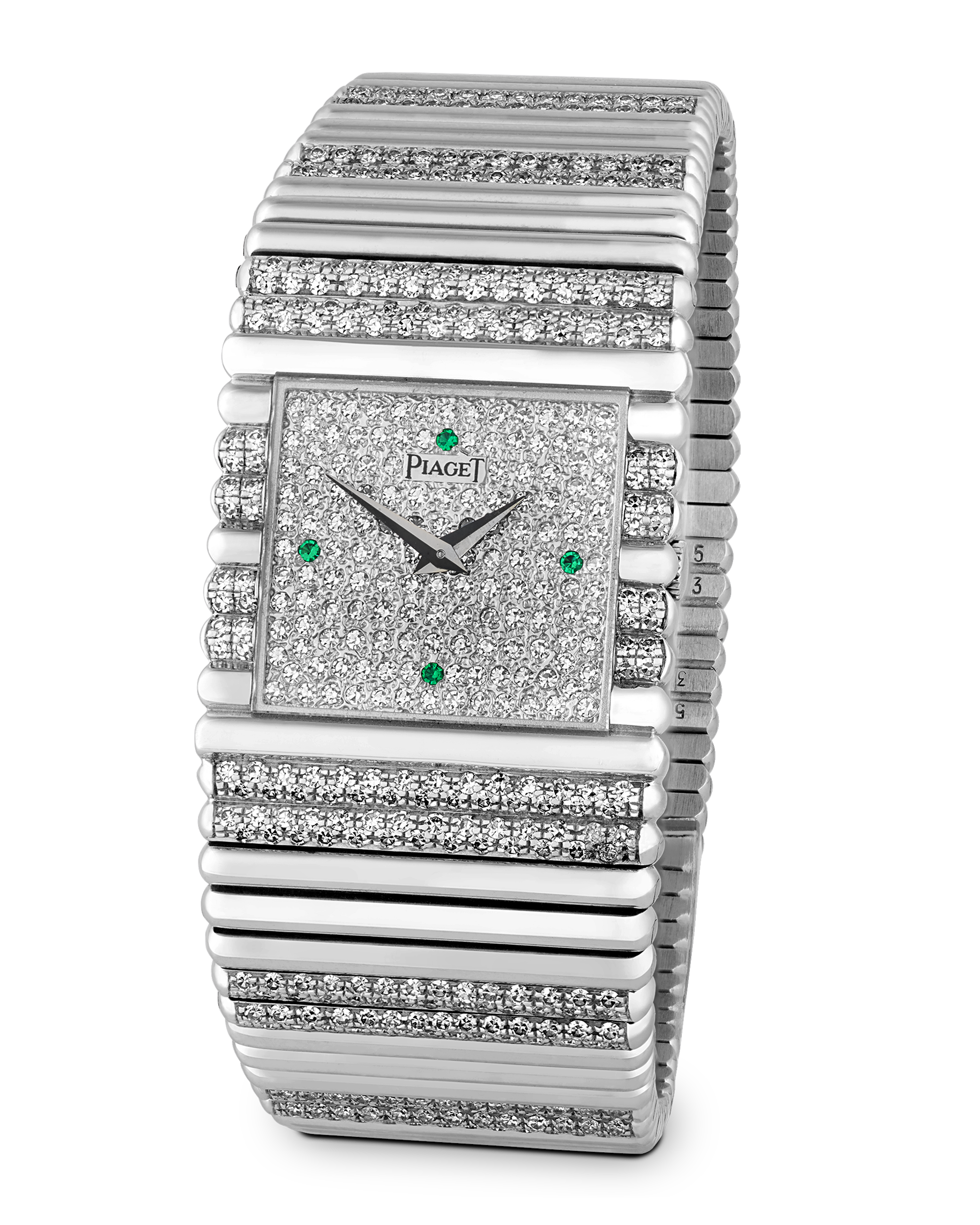 Uniting high jewelry with haute horlogerie, this exceptional 1980s Piaget Emperador watch exemplifies the maison’s renowned standards of design. Crafted entirely in 18K white gold, the timepiece dazzles with its factory-set diamond pavé dial, punctuated by four vivid emerald hour markers. Piaget’s signature hand-finished integrated bracelet is fully set with diamonds, a remarkably rare combination with the factory pavé dial and diamond-set case. The bracelet is secured with its clasp.