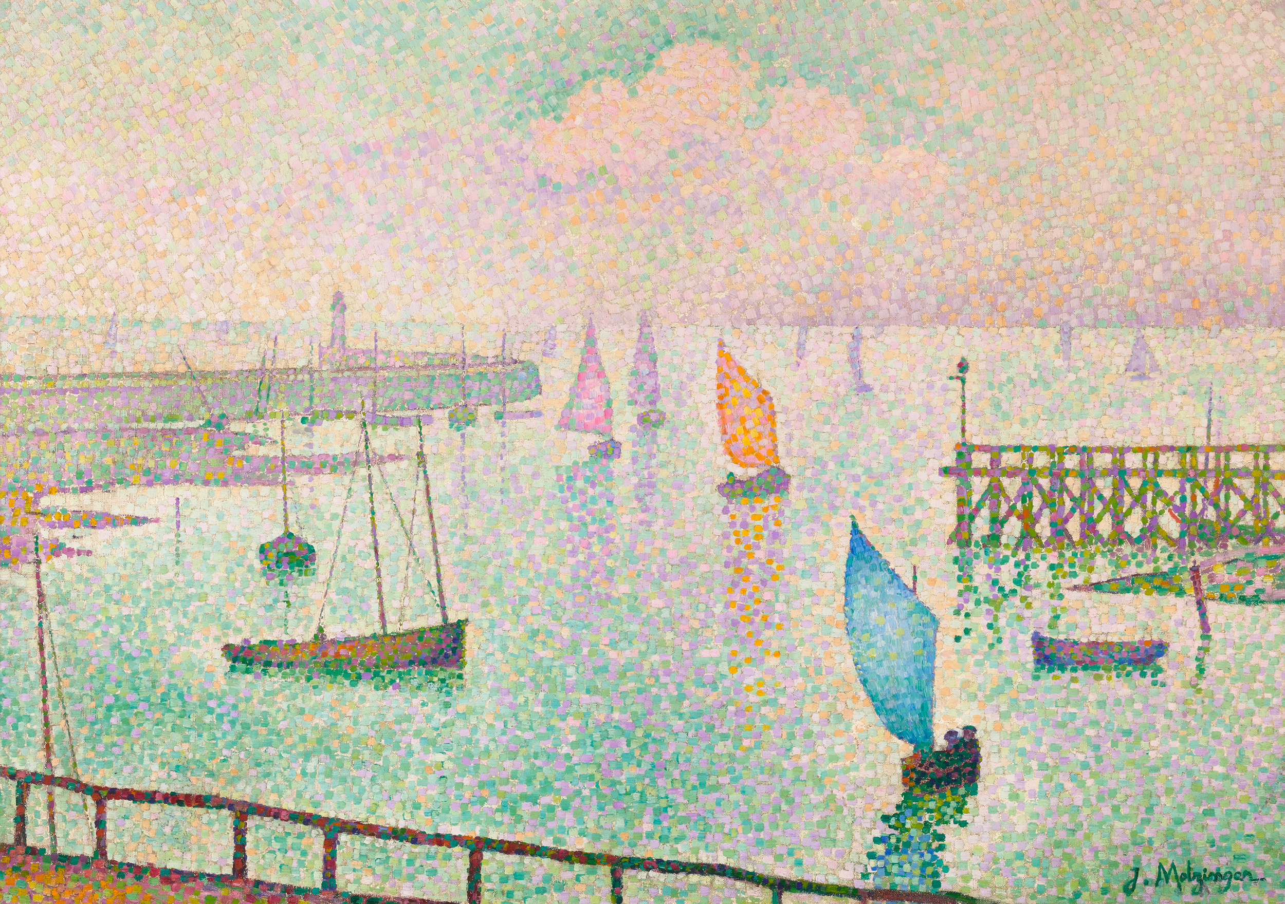 In Port du Croisic, Metzinger’s mastery of Pointillism reaches its fullest expression. Every meticulous brushstroke contributes to the atmospheric harmony of morning light, where sea, sky and sailboats merge through a symphony of optical vibration. Inspired by Seurat and Signac, Metzinger absorbed and advanced the innovations of their Divisionist techniques, reinvigorating the style with new vitality after Seurat's death in 1891. His interest in mathematics and optics allowed him to transform the mosaic-like application of pure color into a tool for expressive abstraction.
