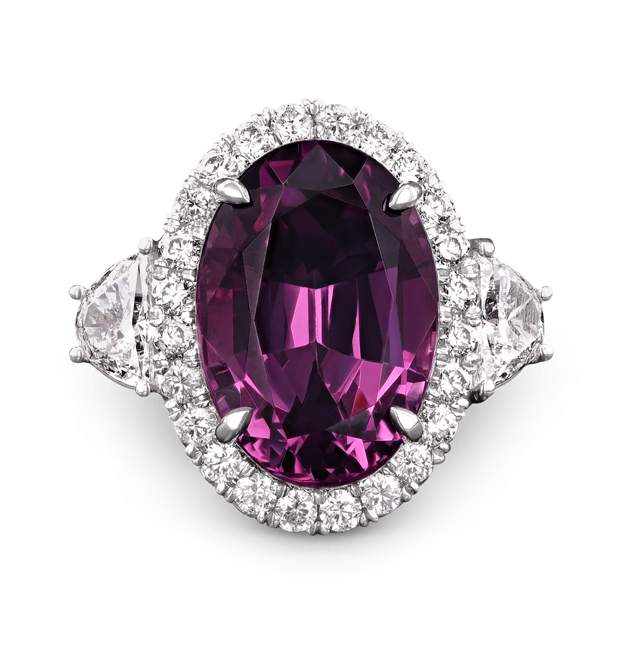 This striking ring showcases a richly saturated 14.30-carat purple spinel of remarkable depth and radiance. The oval shaped spinel is prized for its extraordinary color—a regal, vivid purple that rivals even the finest sapphires. Spinels are celebrated for their incredible range of color and natural brilliance, and this example captures the gemstone’s finest qualities. The center stone is framed by 2.50 carats of shimmering white diamonds. Set in platinum and 18K white gold.