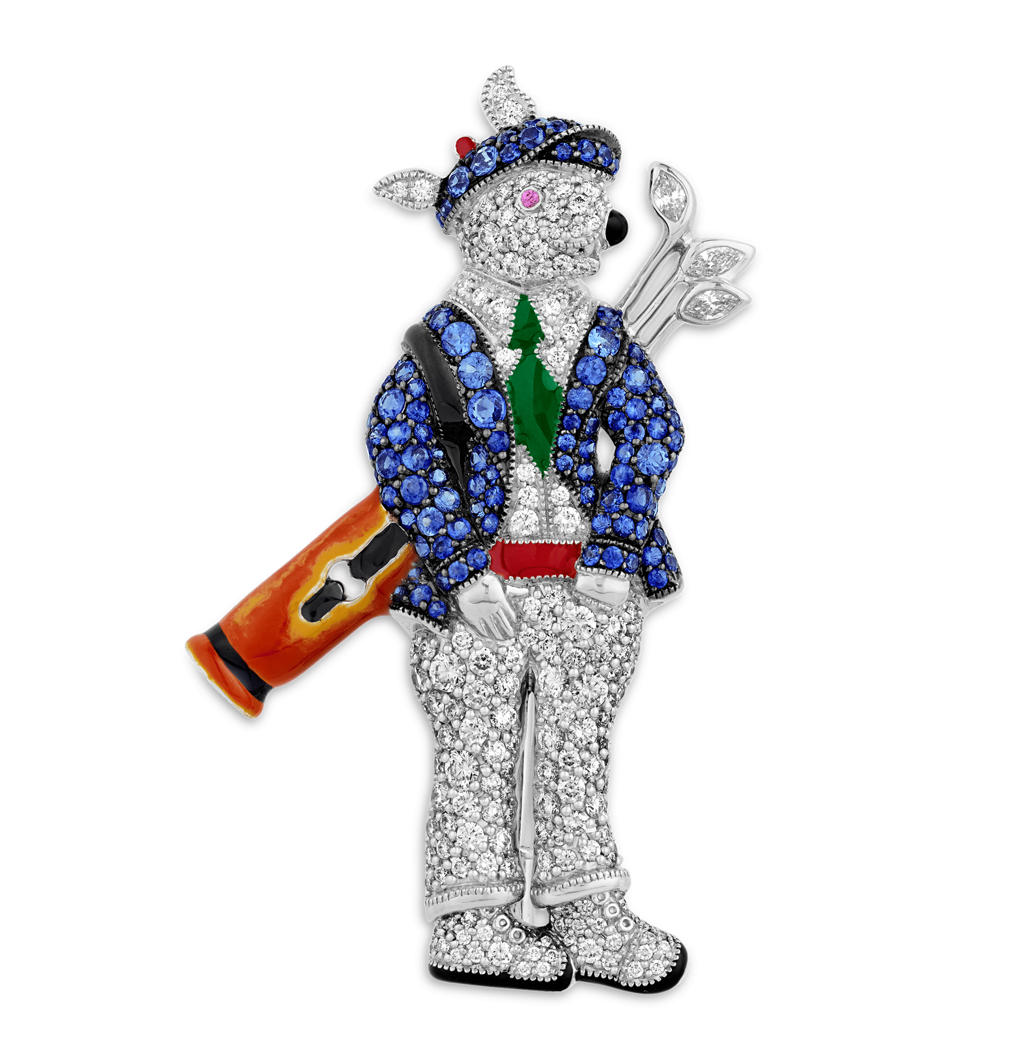 The brooch is adorned with 104 round cut blue sapphires totaling 1.20 carats, making up the rabbit’s blue sports coat and newsboy cap. The green tie is elevated by 161 round diamonds with a total weight of 1.07 carats, forming his pants and shoes, further accentuated by three marquise cut white diamonds weighing 0.14 carat. A single round ruby glitters as his eye and an accent of red enamel punctuates his cap, tying in his red enamel golf bag. The stylish sportsman stands with his hands in his pockets as if waiting to assist his golfer. Set in platinum.