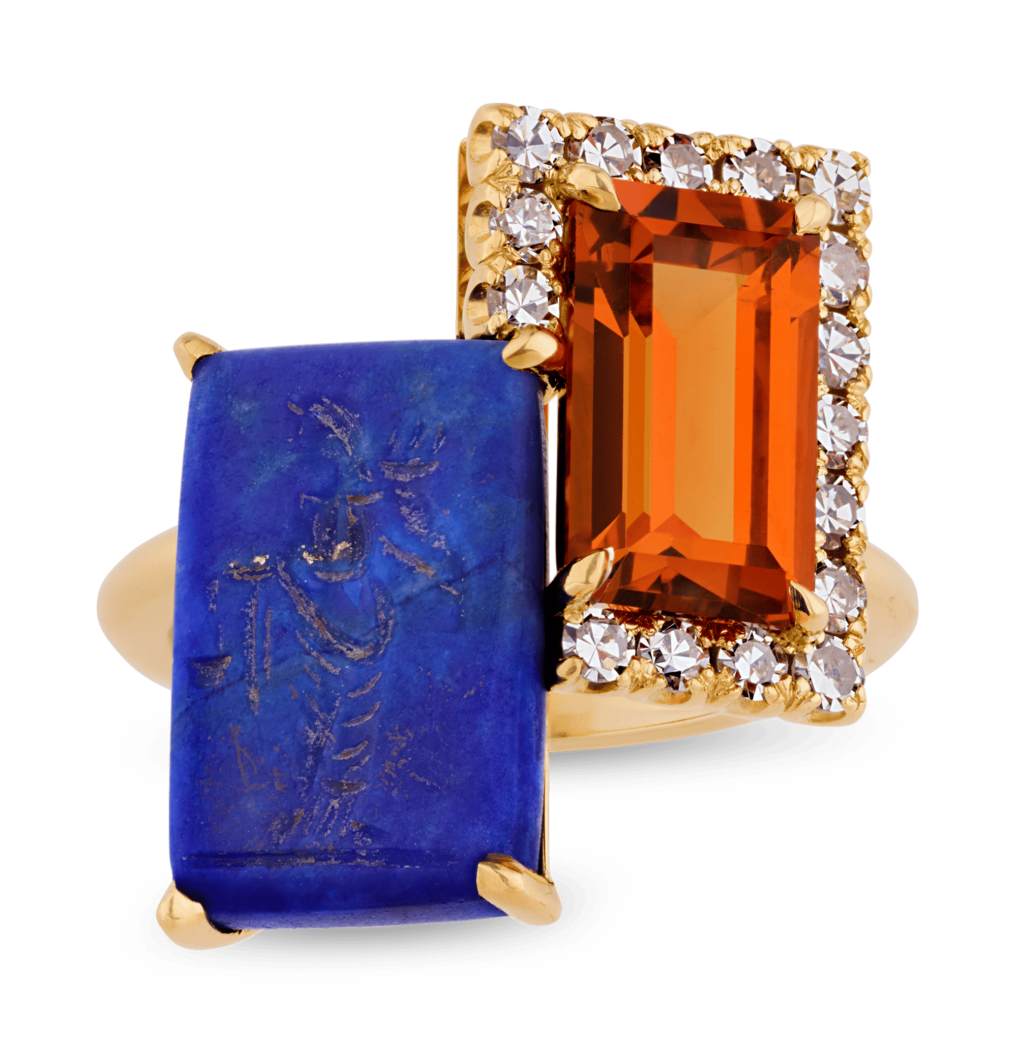 - This Rebecca Rau design features an ancient Roman lapis lazuli intaglio with a Spessartite garnet