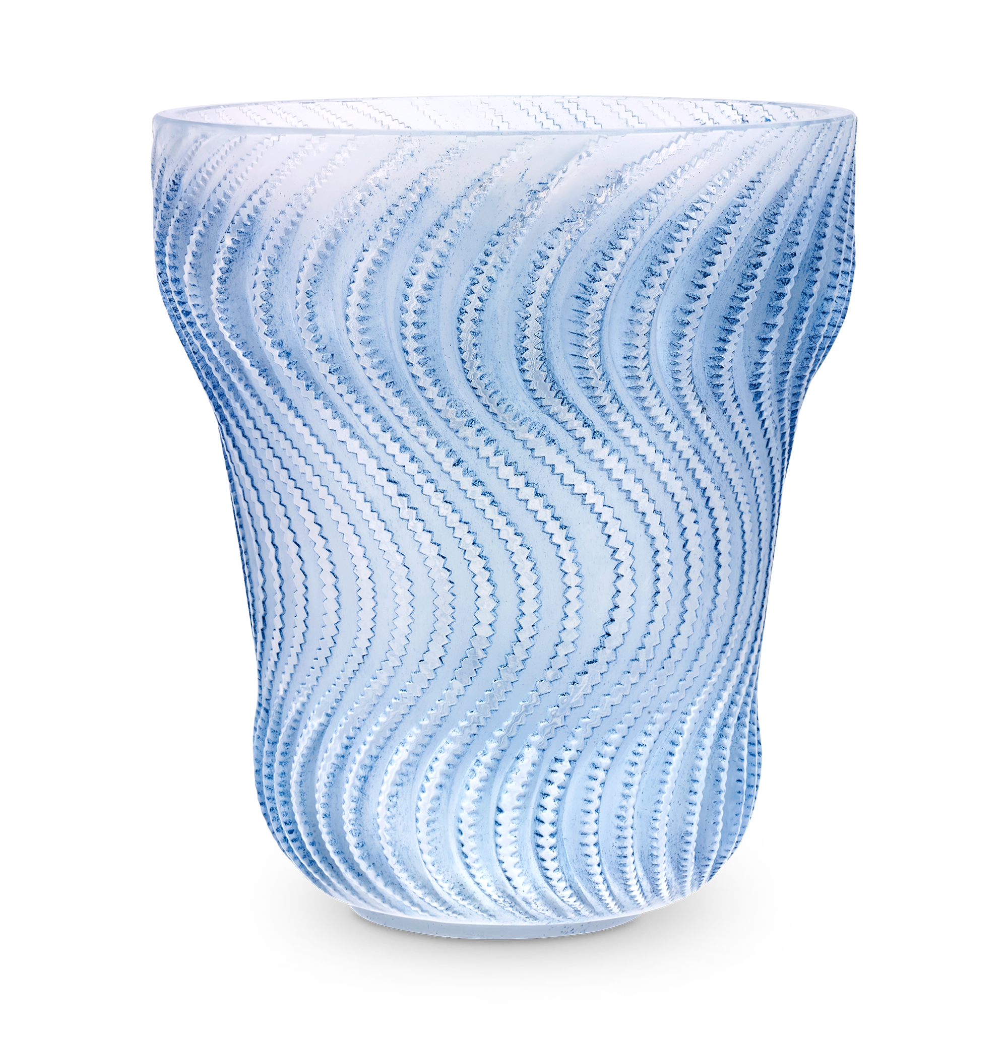 Catching the light with its dynamic surface, the Actinia vase exemplifies René Lalique’s mastery of Art Deco glass. The undulating form is defined by swirling saw-tooth lines, enhanced by blue patinated pressed-molded glass that creates depth and movement.