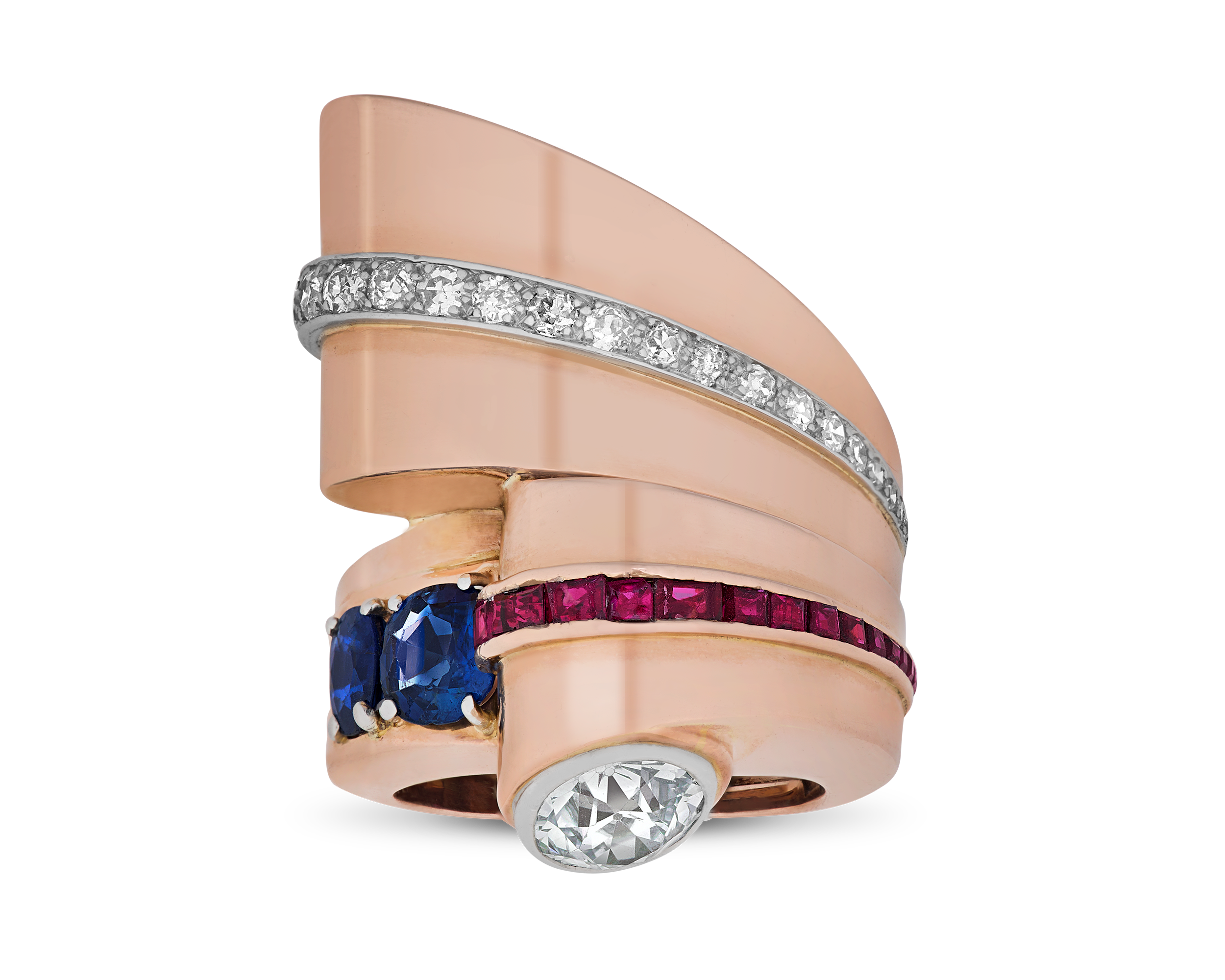 - Bold geometry and vibrant color define this sculptural Retro ring from the 1940s