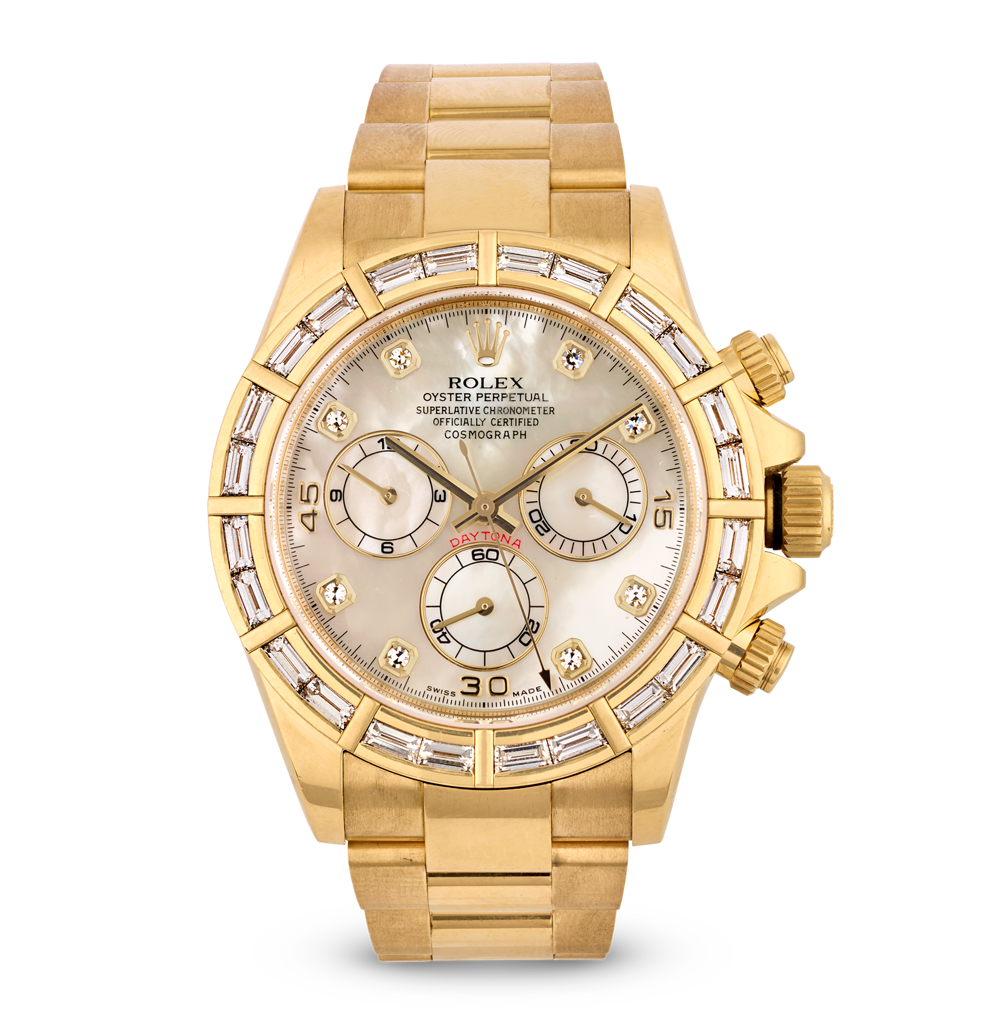 - The striking yellow mother-of-pearl dial features Rolex factory diamond hour markers