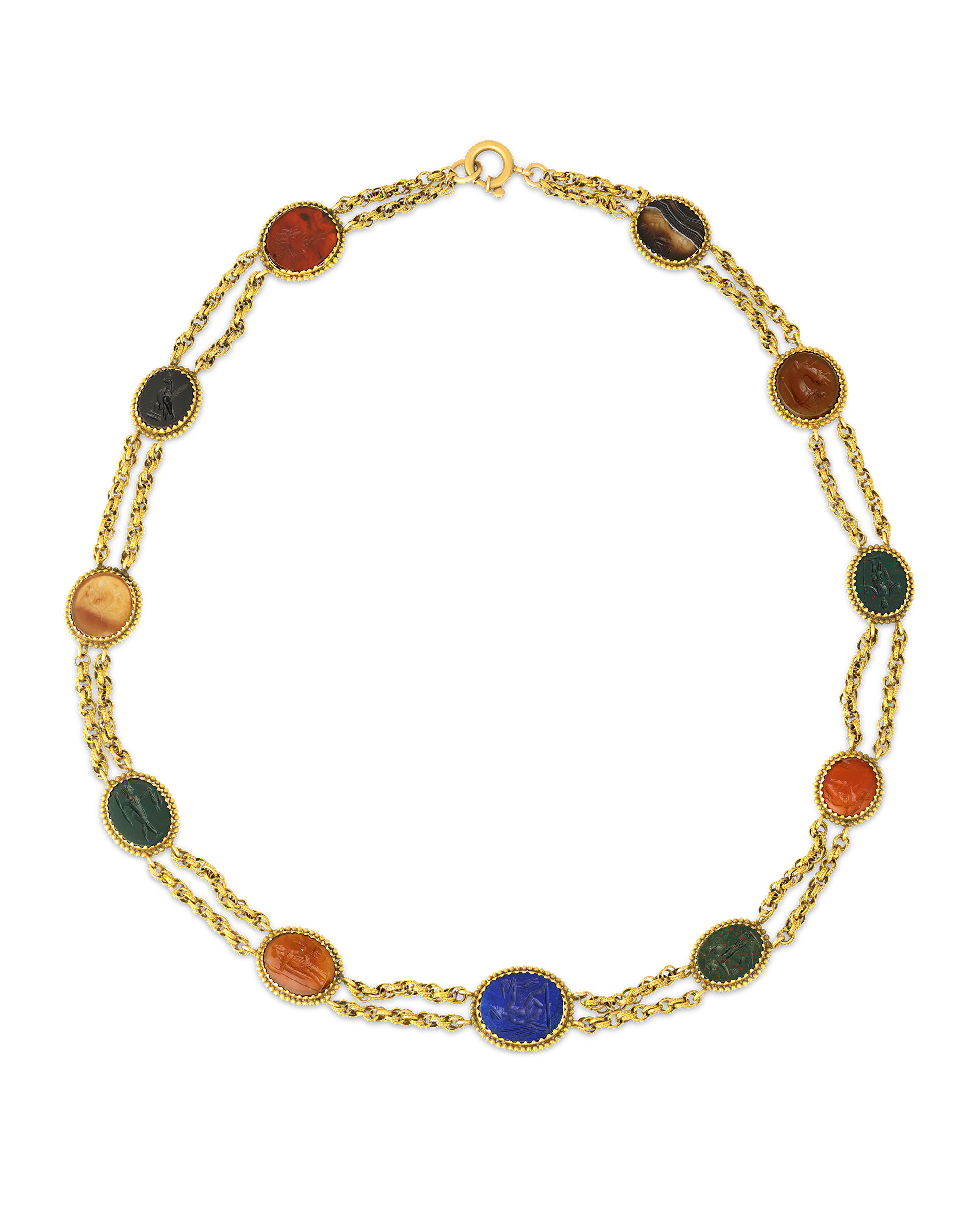 This necklace includes ancient intaglios carved from a variety of gemstones, including carnelian, bloodstone, and lapis lazuli. Classic in execution and style, these intaglios feature everything from portraits and mythological scenes to animals and classical vases. Six intaglios, featuring birds and hunting scenes, date to Roman antiquity, while the remaining five were carved in the 18th century. Each design was painstakingly etched into the surface of the gemstone, giving zero room for error.