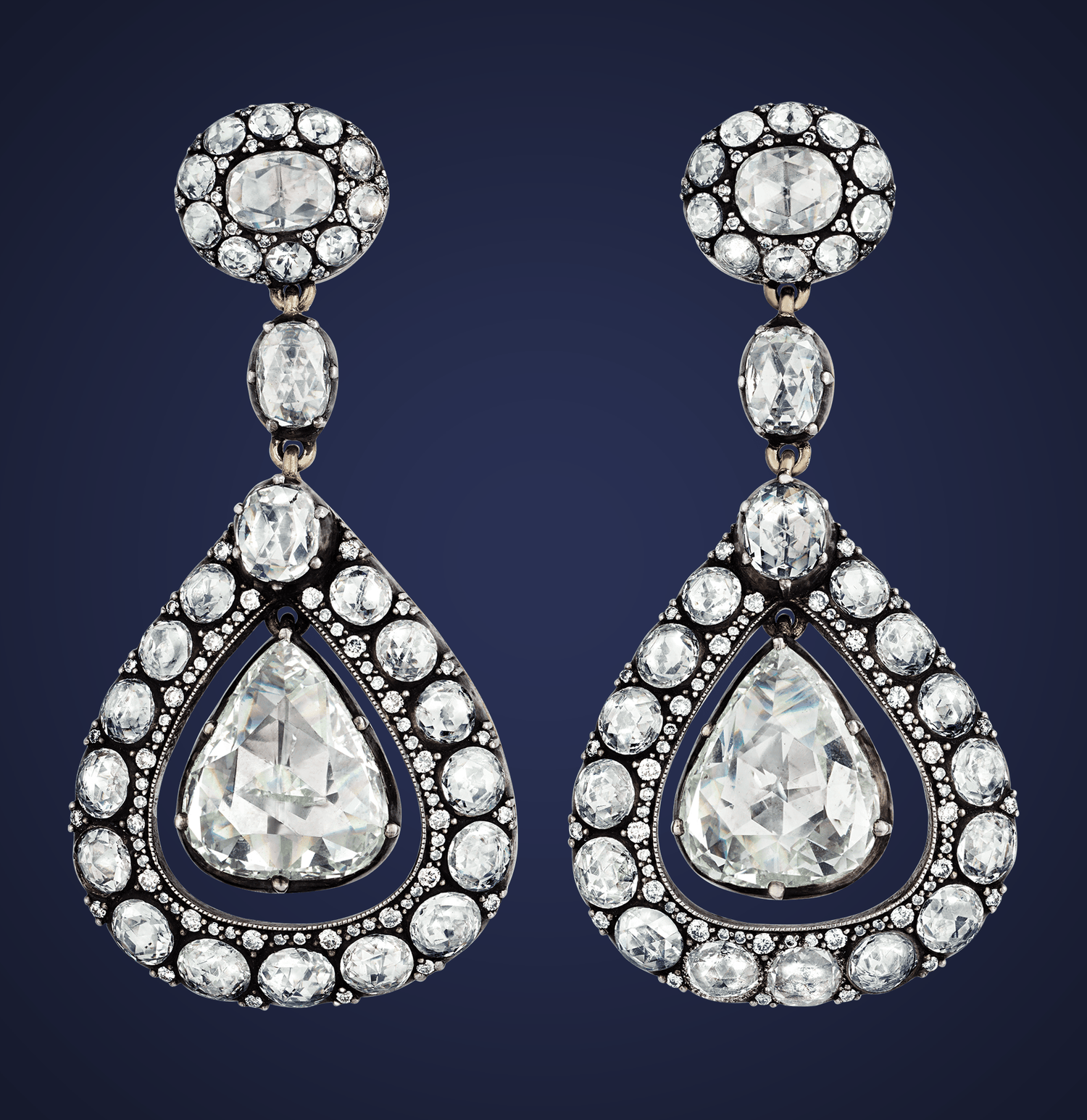 - Each earring centers a magnificent rose cut pear shaped diamond weighing approximately 5 carats