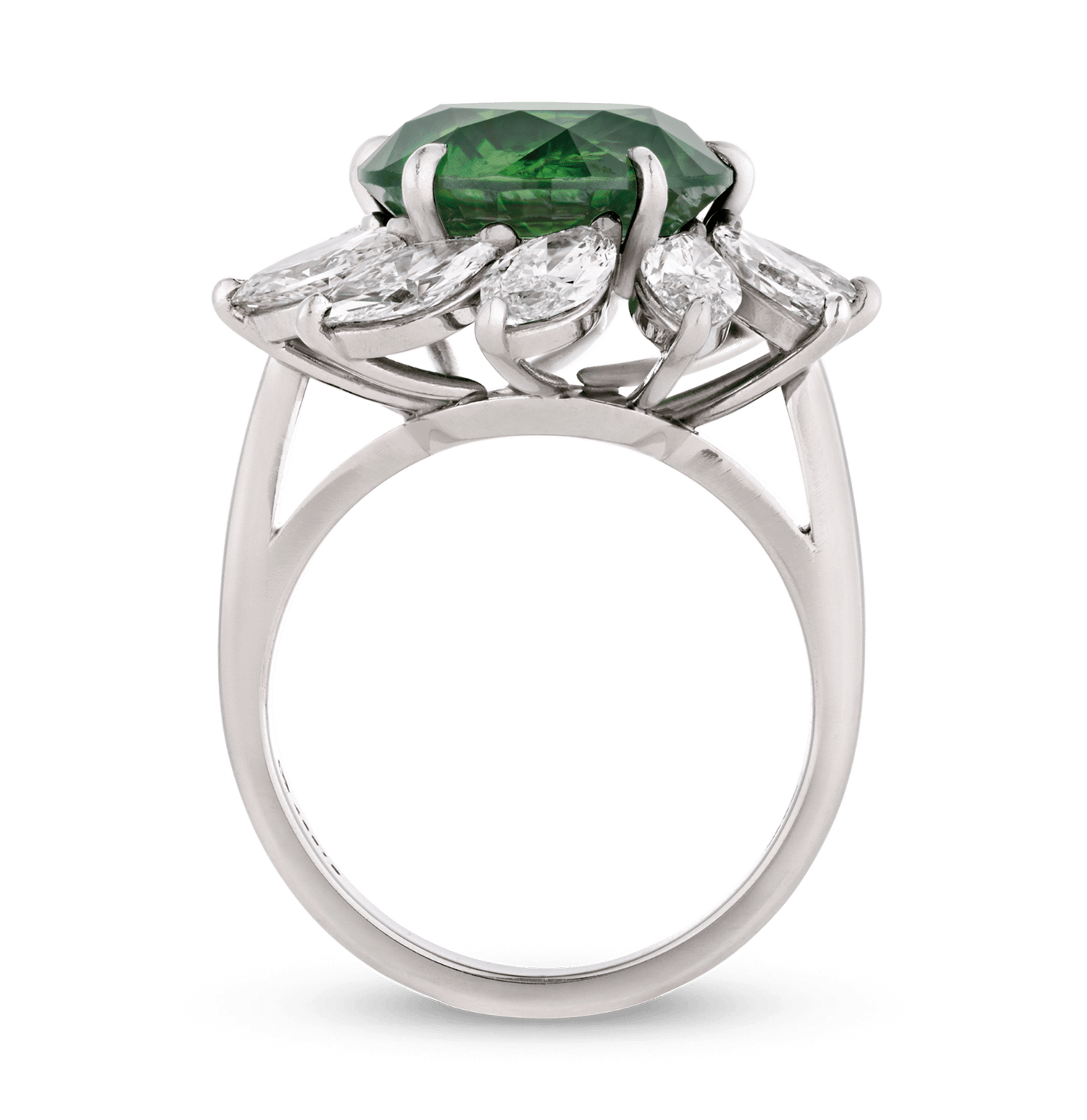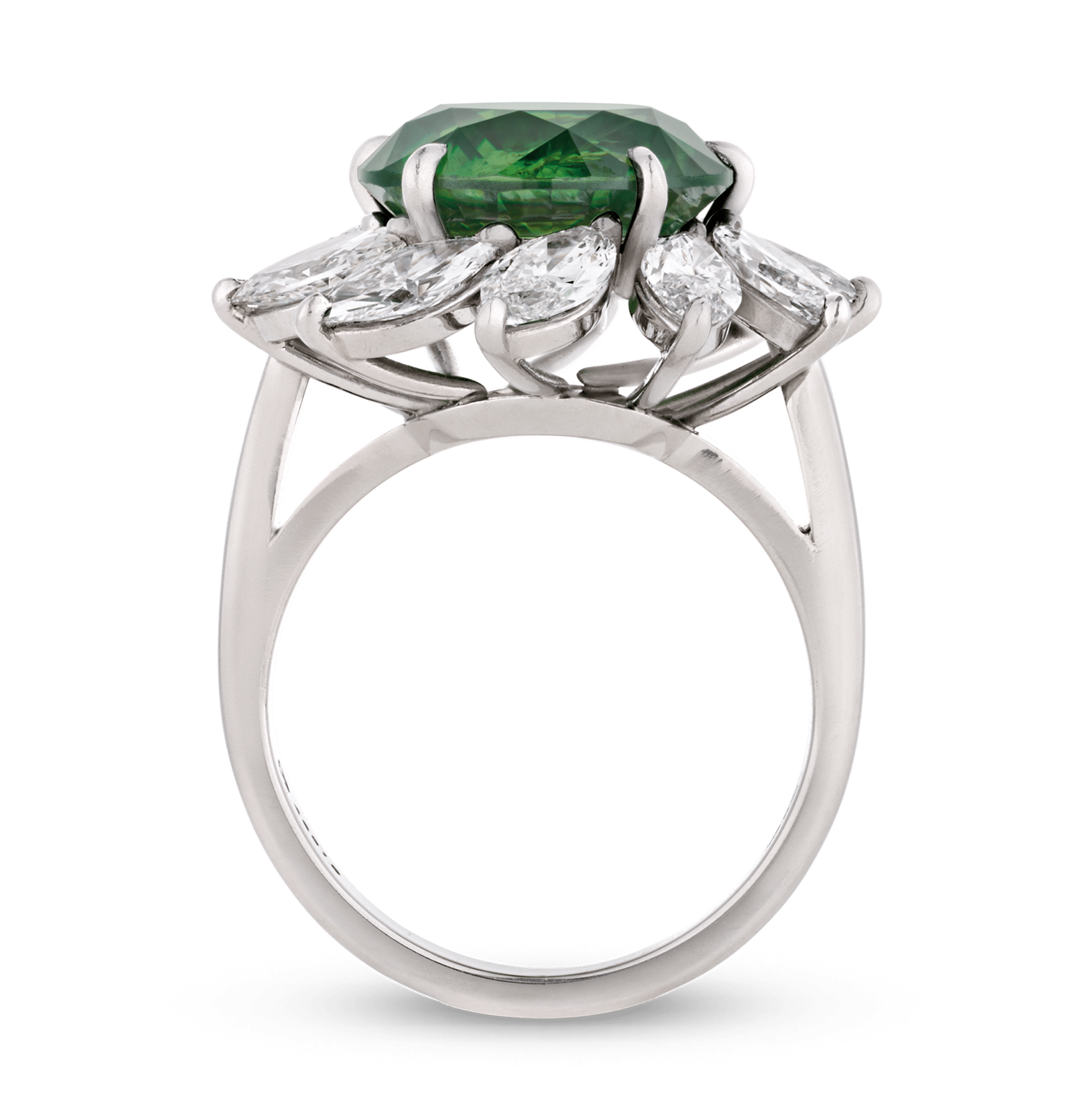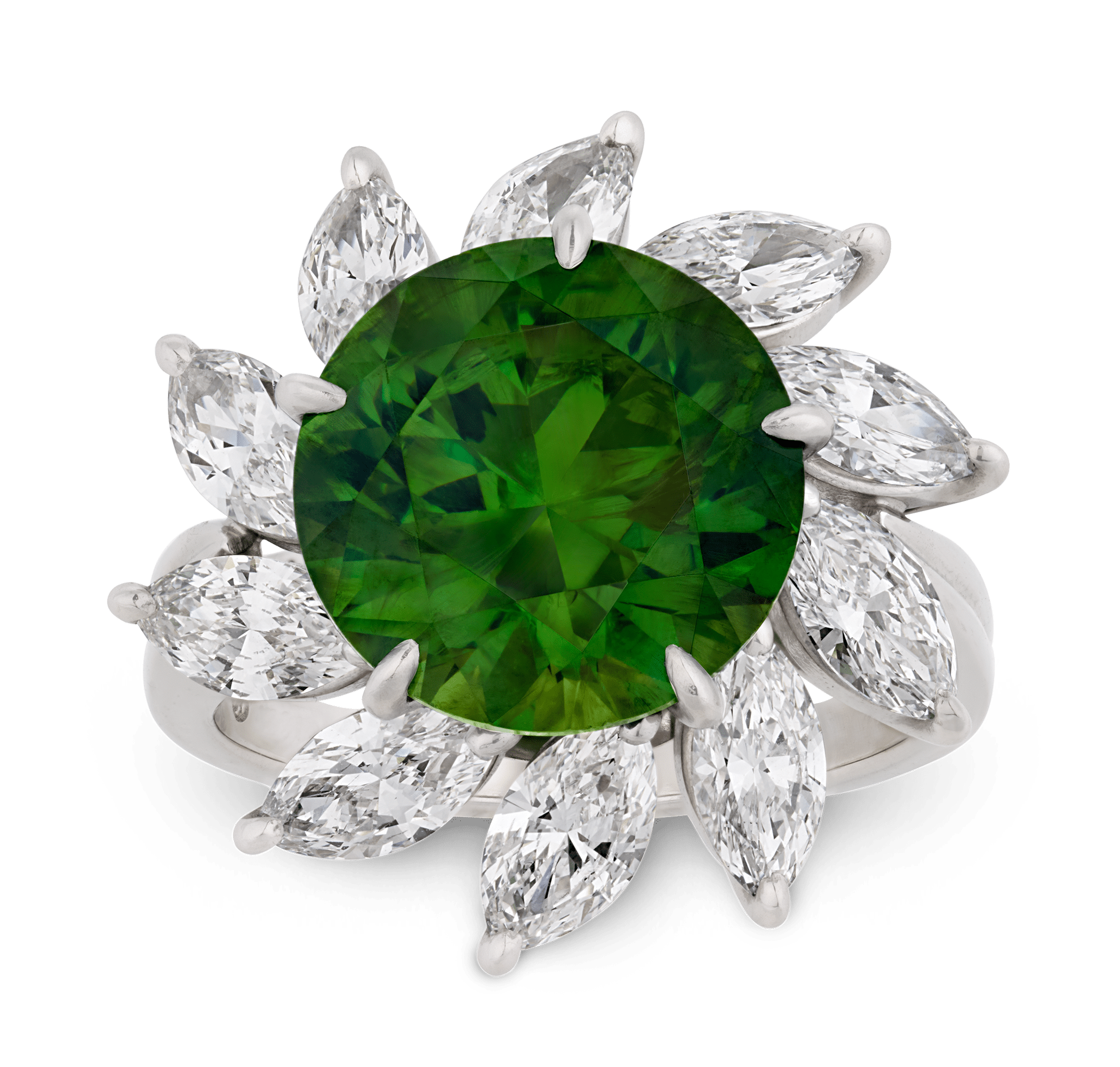 - The 7.55-carat demantoid garnet set in this ring exhibits an incomparable brilliance