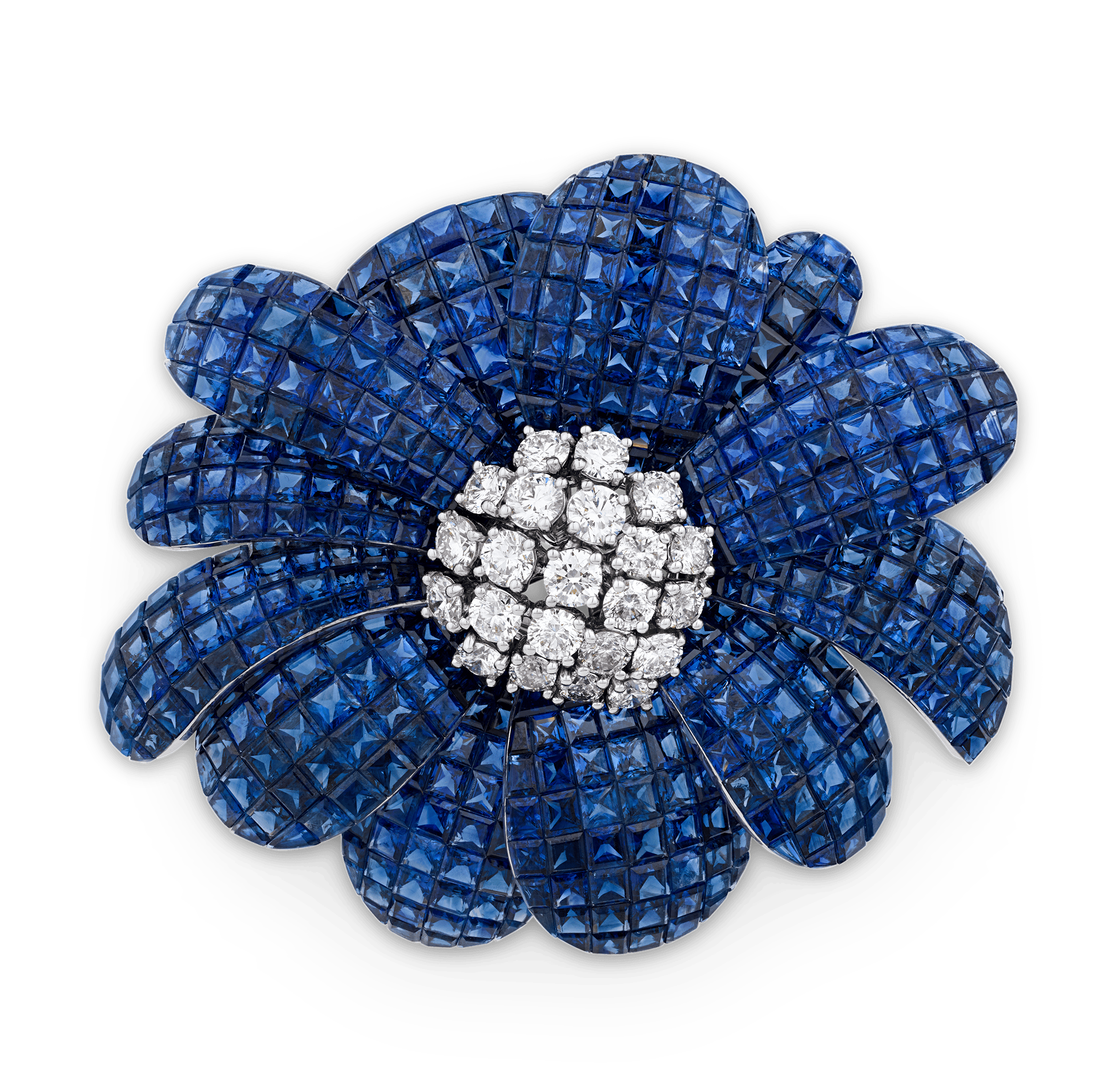 - This dazzling flower brooch showcases 76.88 carats of vivid blue sapphires