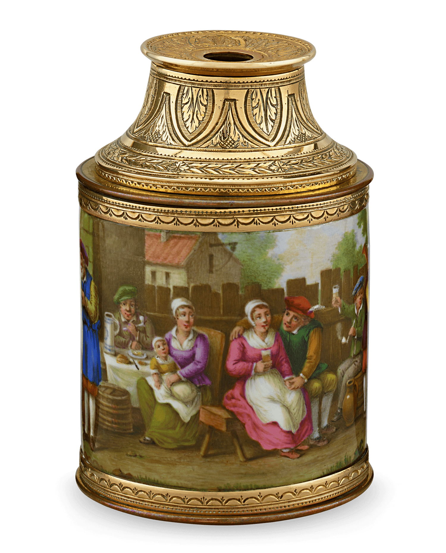 - The shaft is decorated with a charming scene of dancing tavern-goers