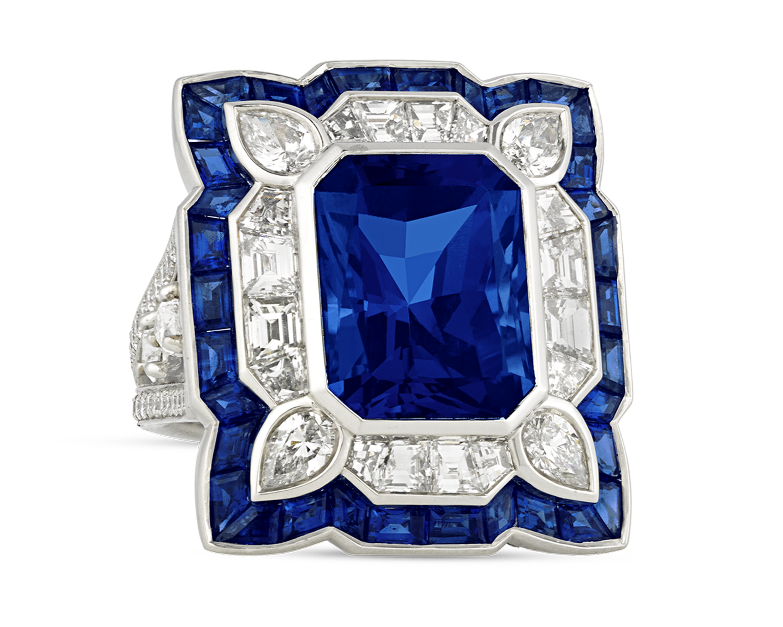 - This geometric ring showcases a tanzanite weighing 10.79 carats