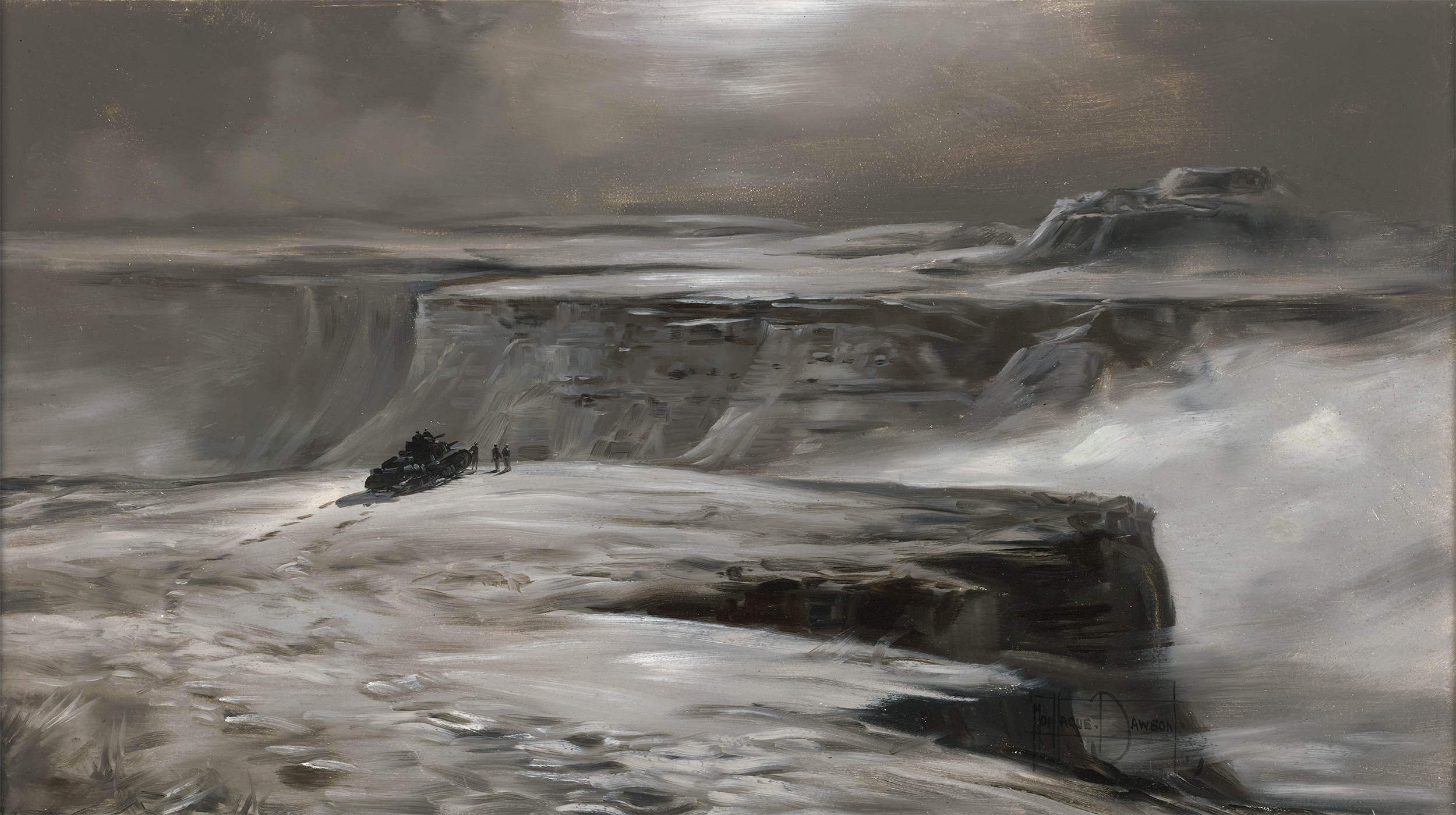 The composition unfolds beneath a stark, moonlit sky, where the British Eighth Army under General Montgomery advances through an unforgiving wilderness of sand, rock and shadow. Dawson renders the desert as a colossal force in itself, carved by immense ravines and escarpments so vast they appear capable of swallowing entire towns. A solitary Grant tank stands on the rugged terrain, overlooking the deep ravine. The landscape conveys both the physical brutality of the campaign and the psychological toll borne by the advancing forces.