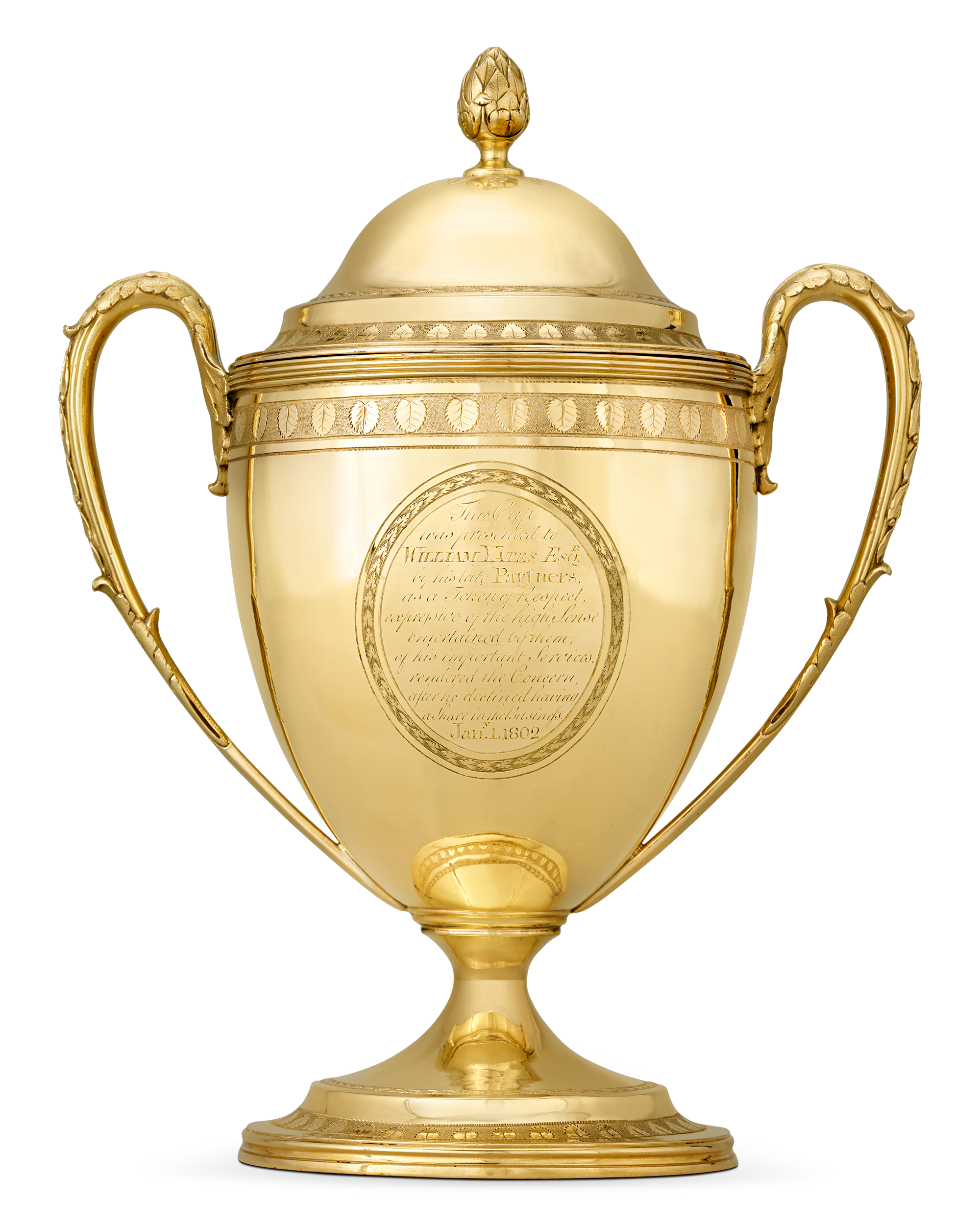 Inscribed “This Cup was presented to WILLIAM YATES ESQ. by his late Partners as a Token of Respect expressive of high Sense entertained by them, of his important Services rendered the concern after he declined having a Share in the Business January: 1. 1802”