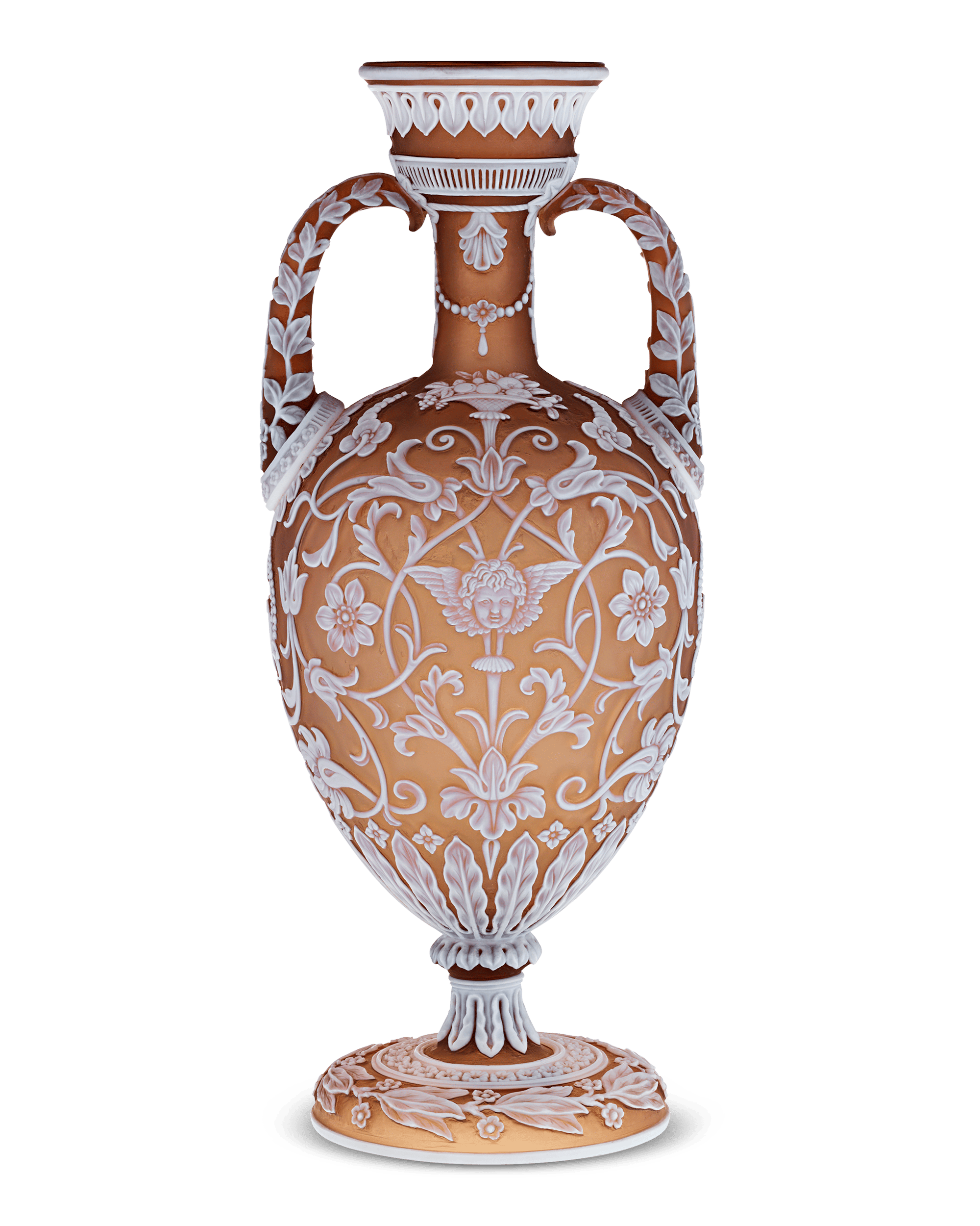 This intricately crafted amphora vase exemplifies Thomas Woodall’s expertise as a designer. The two-handled vase stands gracefully, overlaid in opaque white, and carved through to the light brown glass underneath with foliate Berainesque ornament, leaf garlands and delicate flowers.