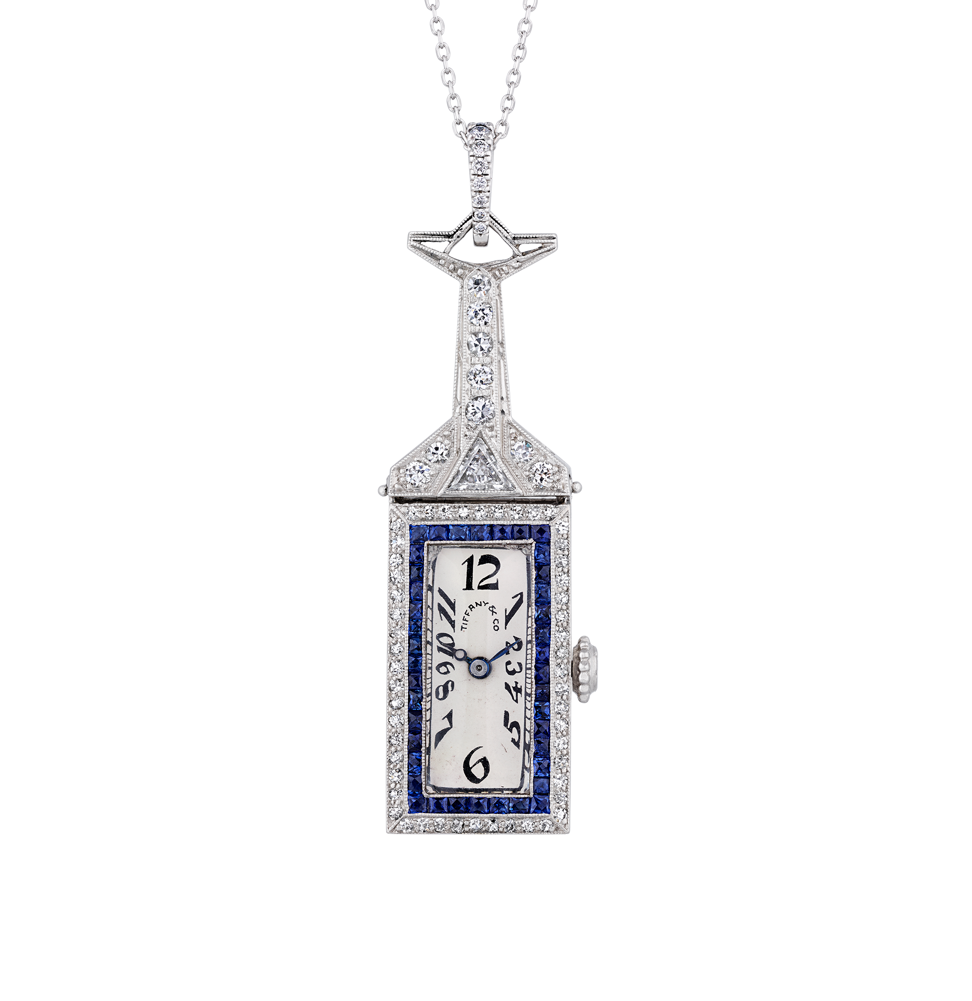 A dazzling testament to Art Deco elegance and horological mastery, this exquisite Tiffany & Co. pendant watch with its C.H. Meylan movement combines technical brilliance with exceptional design. The rectangular dial shows exploding Arabic numerals in a bold Art Deco style, while the surrounding case is set with diamonds and calibré cut sapphires. The platinum mount displays millegrain detailing and a striking triangular bail and crown,. . .