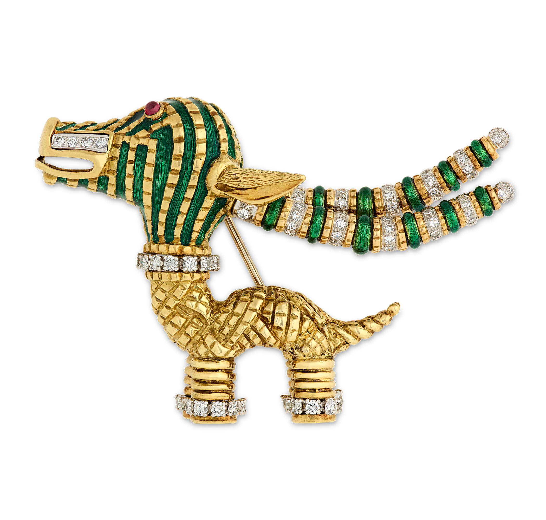 - Crafted in 18K yellow gold and platinum, the brooch is detailed with enamel, diamonds and rubies