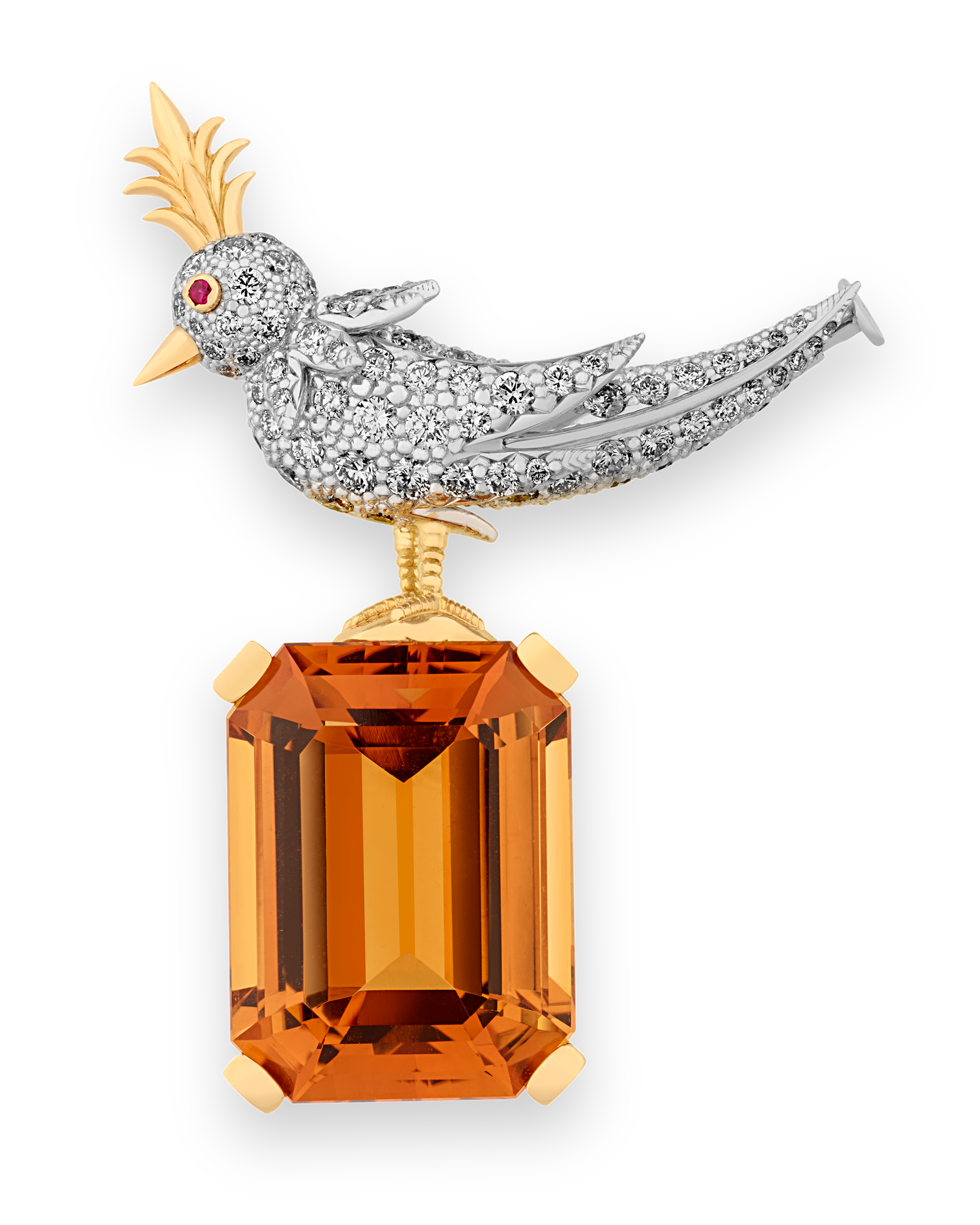 - The jewel-encrusted bird perches atop a monumental cushion cut citrine weighing 31.22 carats