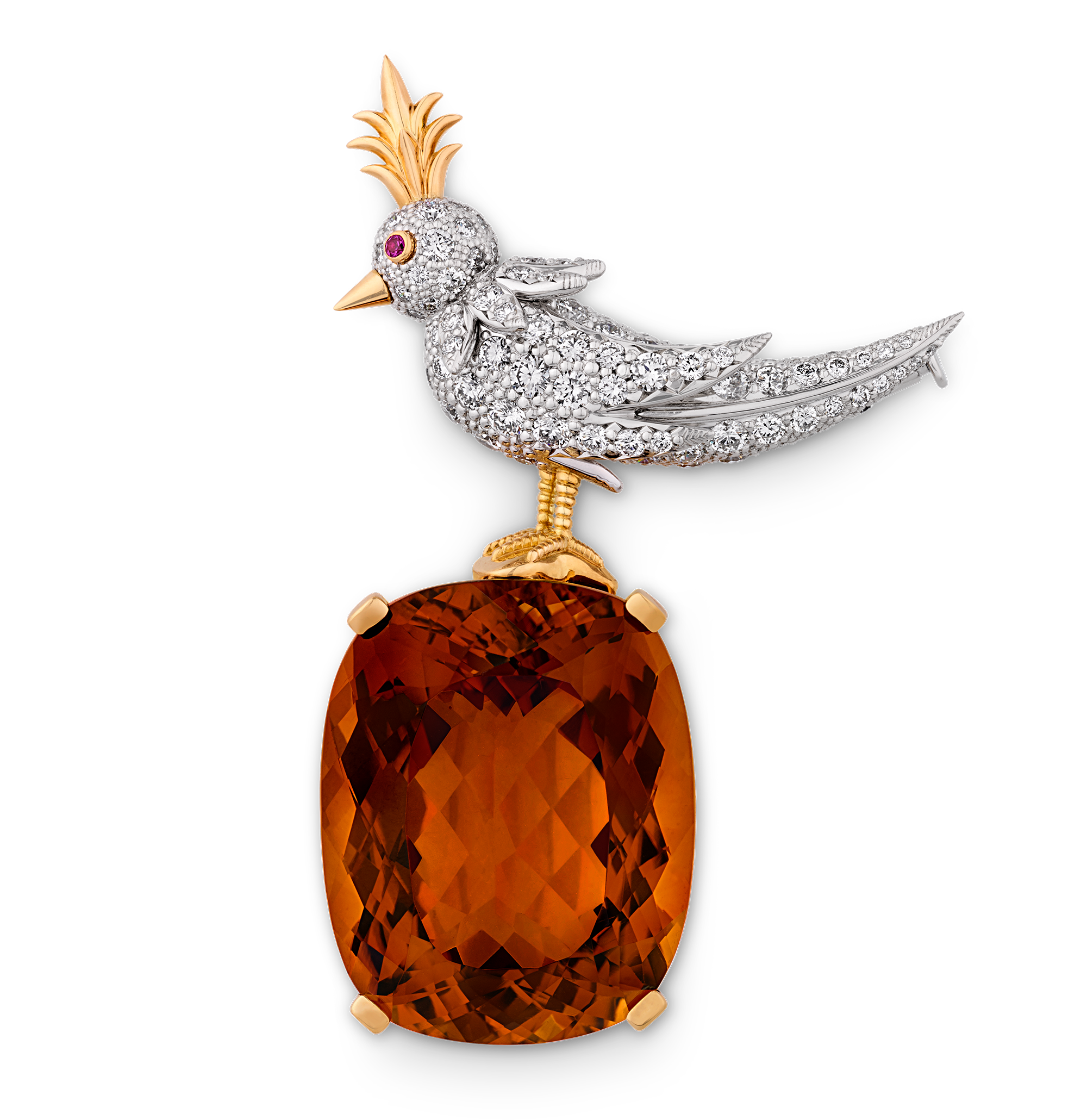 - The diamond-encrusted bird is crafted in platinum and 18K gold
