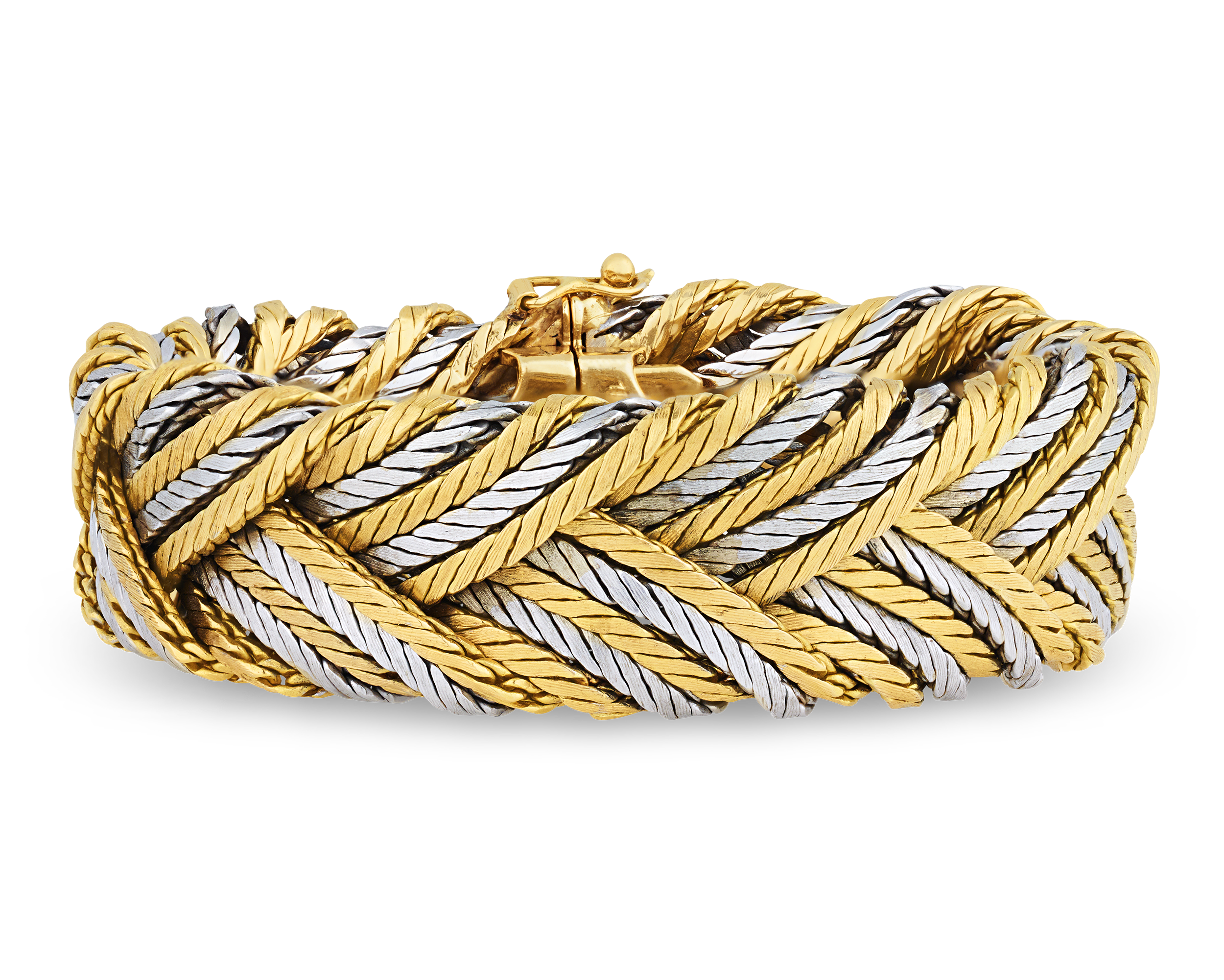 Founded in 1919, the Buccellati jewelry house is famed for creating luxurious, Renaissance-inspired jewelry. Drawing upon period techniques to craft jewelry in a lacy, textural style, the Buccellati name is one of the most recognized jewelers in the world. Their collaboration with the inimitable Tiffany & Co. produced exquisite creations, such as this gold bracelet. Tiffany's tradition of excellence continues to this day, and both antique and contemporary Tiffany jewelry remains highly coveted.