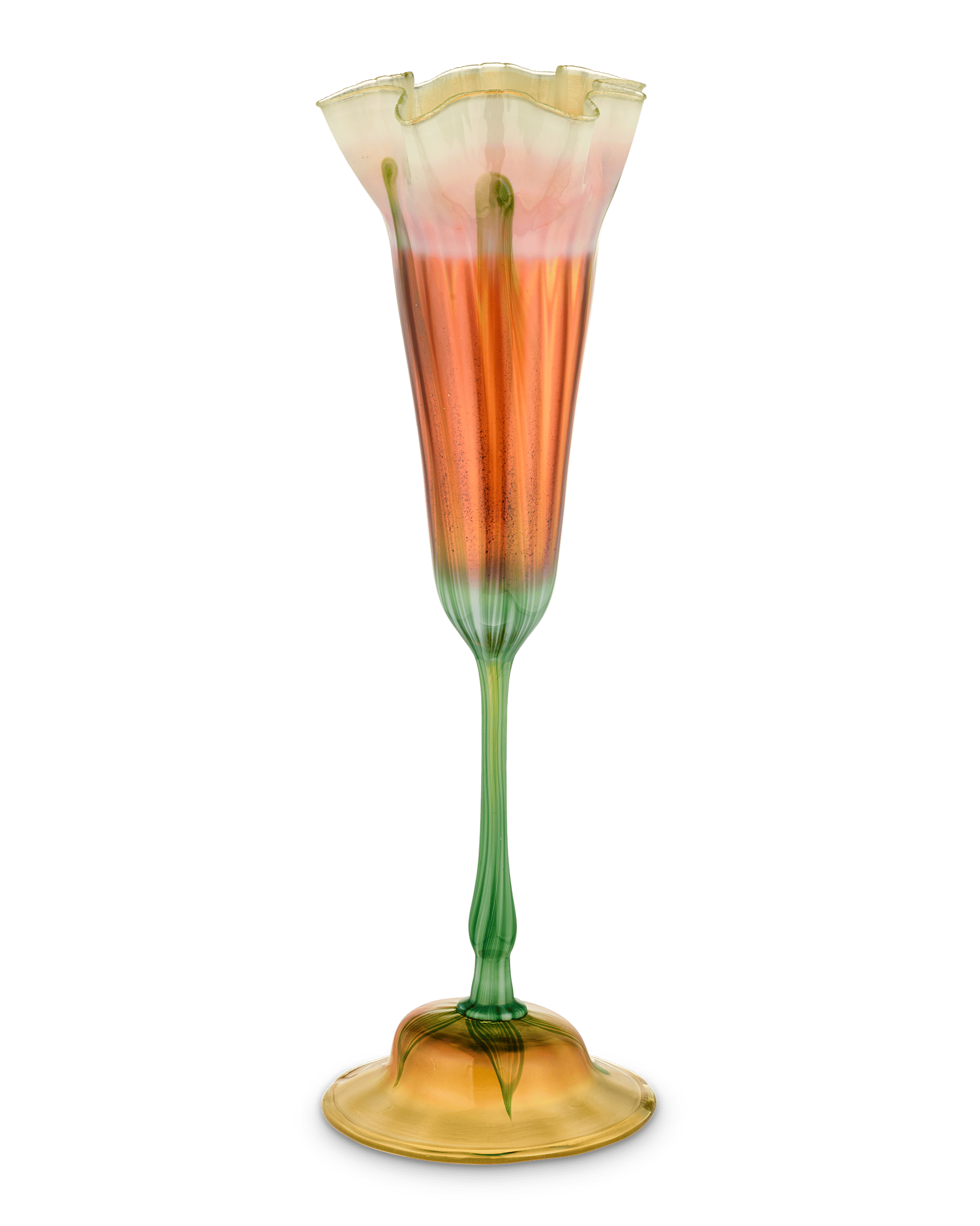 Louis Comfort Tiffany established Tiffany Glass and Decorating Company in 1892, which became Tiffany Studios in 1902. His development of Favrile glass—patented in 1894—revolutionized American decorative arts and positioned him as one of the foremost artists of the Art Nouveau movement. Examples of Tiffany's flower form vases are held in prestigious collections, including the Chrysler Museum and the Metropolitan Museum of Art.