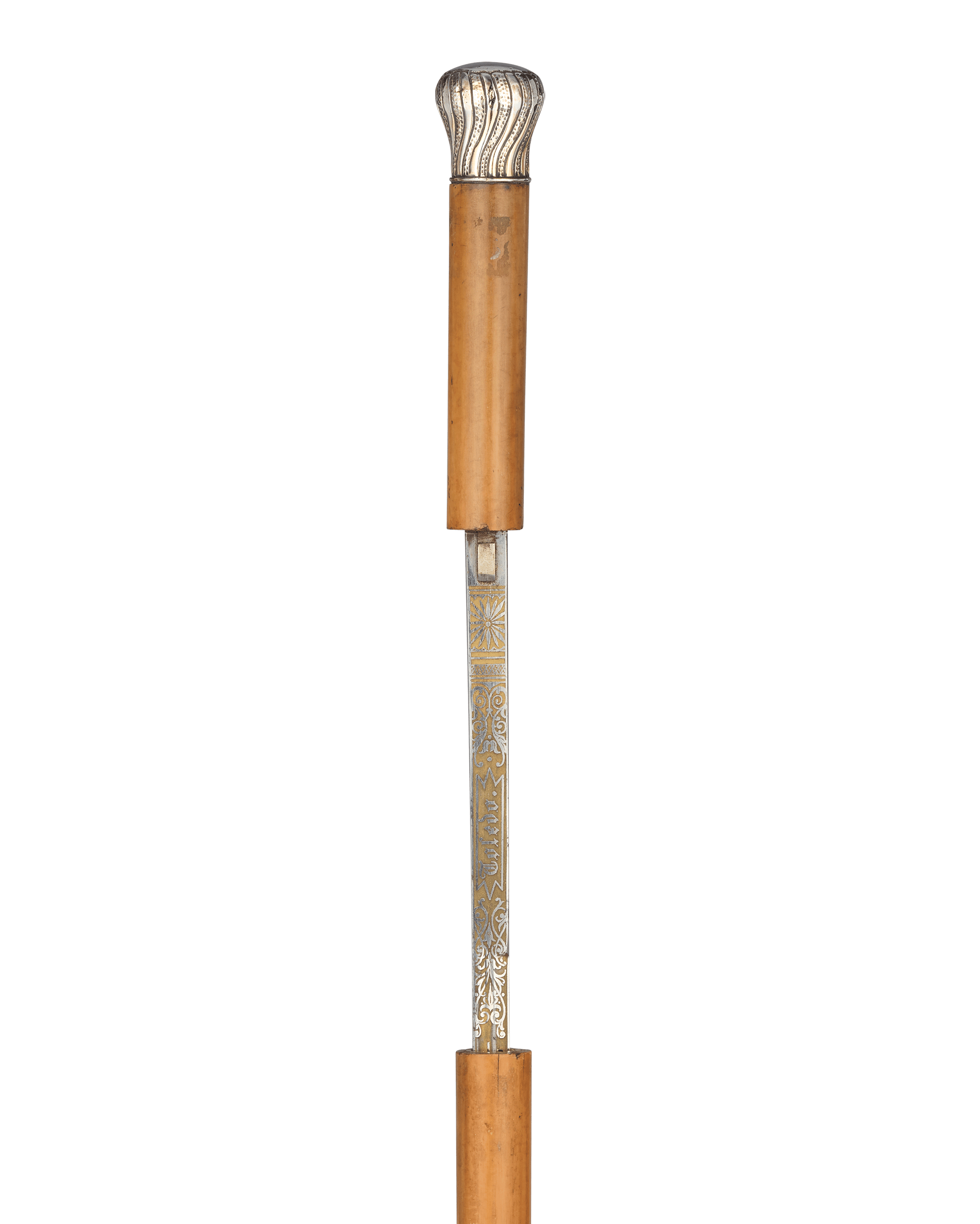 - A lethal Toledo steel sword is concealed within the Malacca shaft of this walking stick