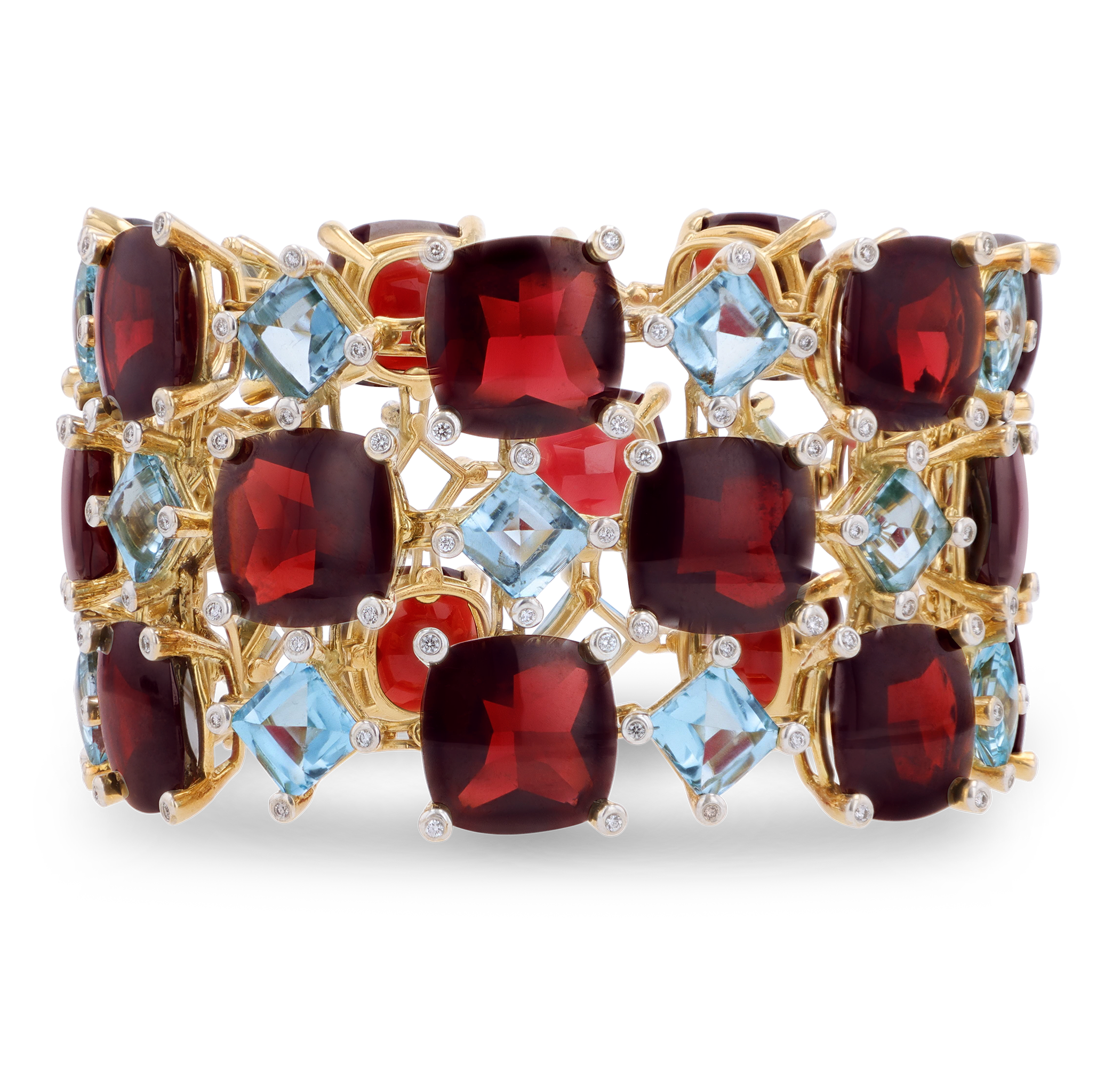 - Comprised of 240 carats of garnets, 60 carats of topaz and 1 carat of diamonds, set in 18K yellow gold