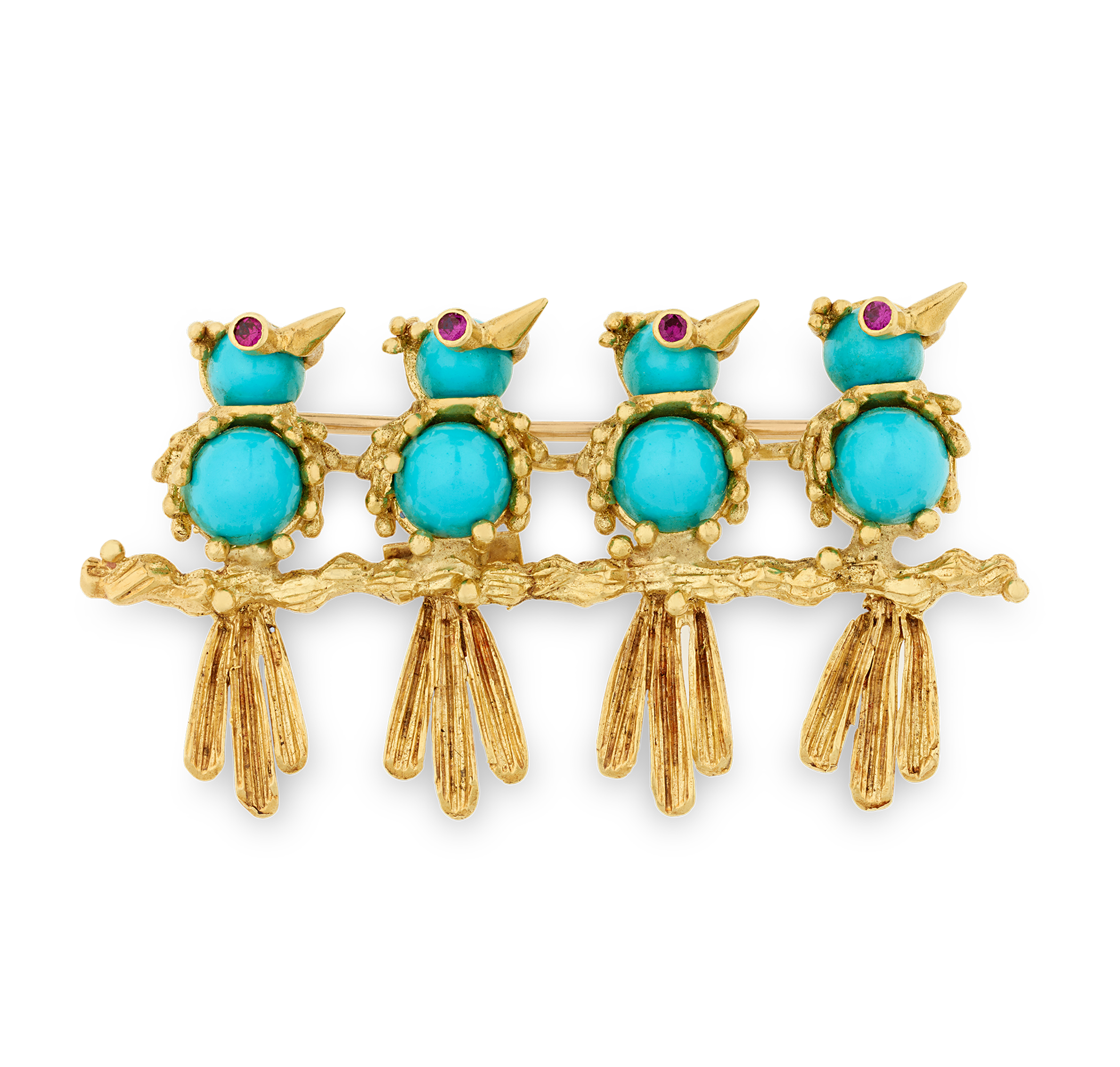 - This brooch is a mesmerizing creation, showcasing four turquoise birds on a golden branch