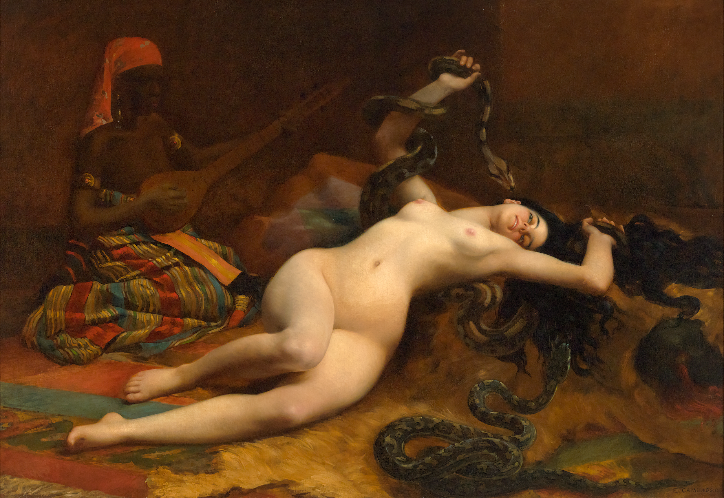 To be invited to showcase a painting in the Paris Salon was often the high point of an artist’s career. Artists reserved their finest creations for this prestigious venue, and Cambiaggio clearly followed suit with Une charmeuse, which was displayed at the 1887 Salon. The reclining figure of the snake charmer at the center is rendered with exceptional refinement and naturalism, reflecting Cambiaggio's talent. The supple modeling of flesh demonstrates his sophisticated understanding of light and form, and the luminous hues and intricate textures that surround the figures bring the mesmerizing scene to life. Every surface, from the radiant skin of the charmer to the rich textiles, is executed with extraordinary control.