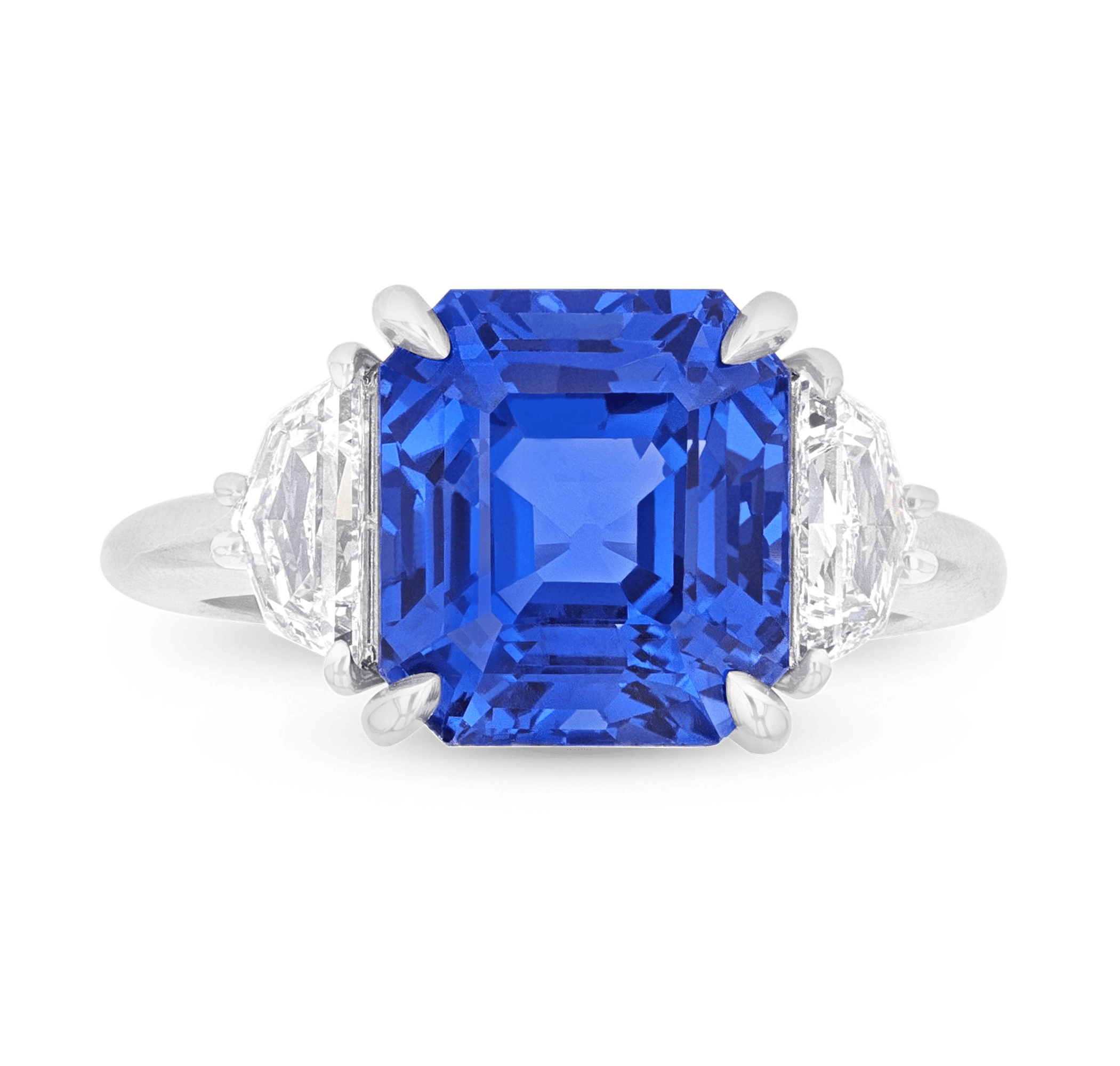 - This exceptional ring showcases an unheated emerald cut Burma sapphire weighing 7.87 carats