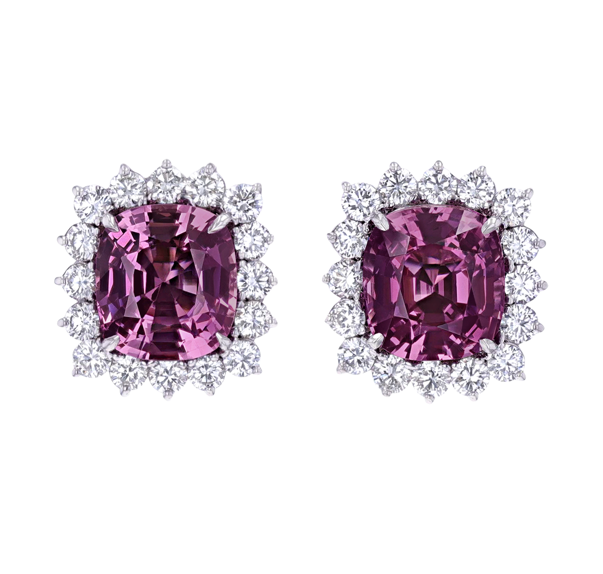 Their vivid purple hue displays remarkable depth and brilliance, a combination that is particularly scarce in spinels of this size and quality. Each gemstone is framed by a halo of bright white diamonds totaling 3.41 carats, creating a luminous contrast that heightens the intensity of the central stones. Set in platinum.
