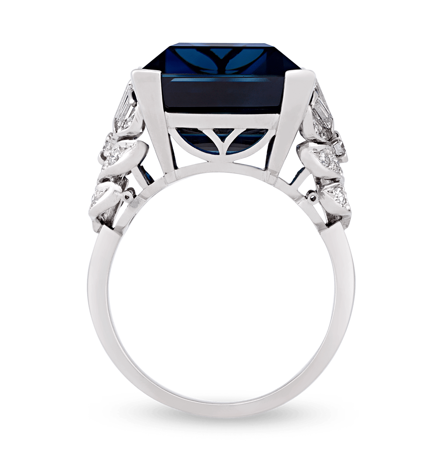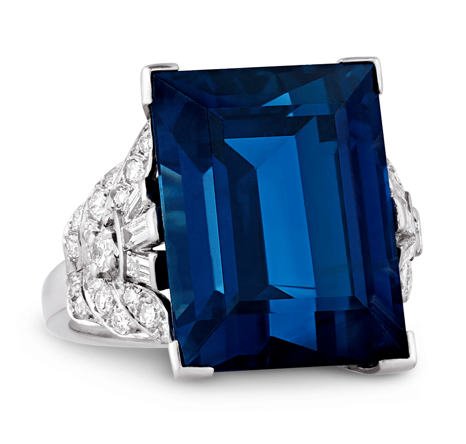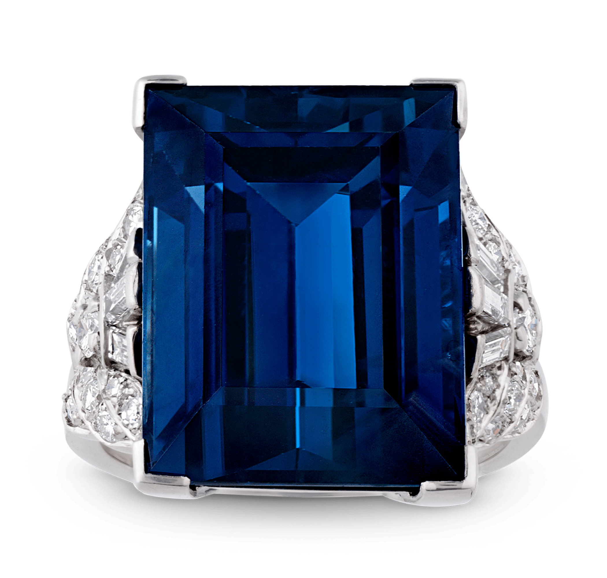 - At the heart of this ring is a rectangular-step cut sapphire weighing an impressive 26.98 carats