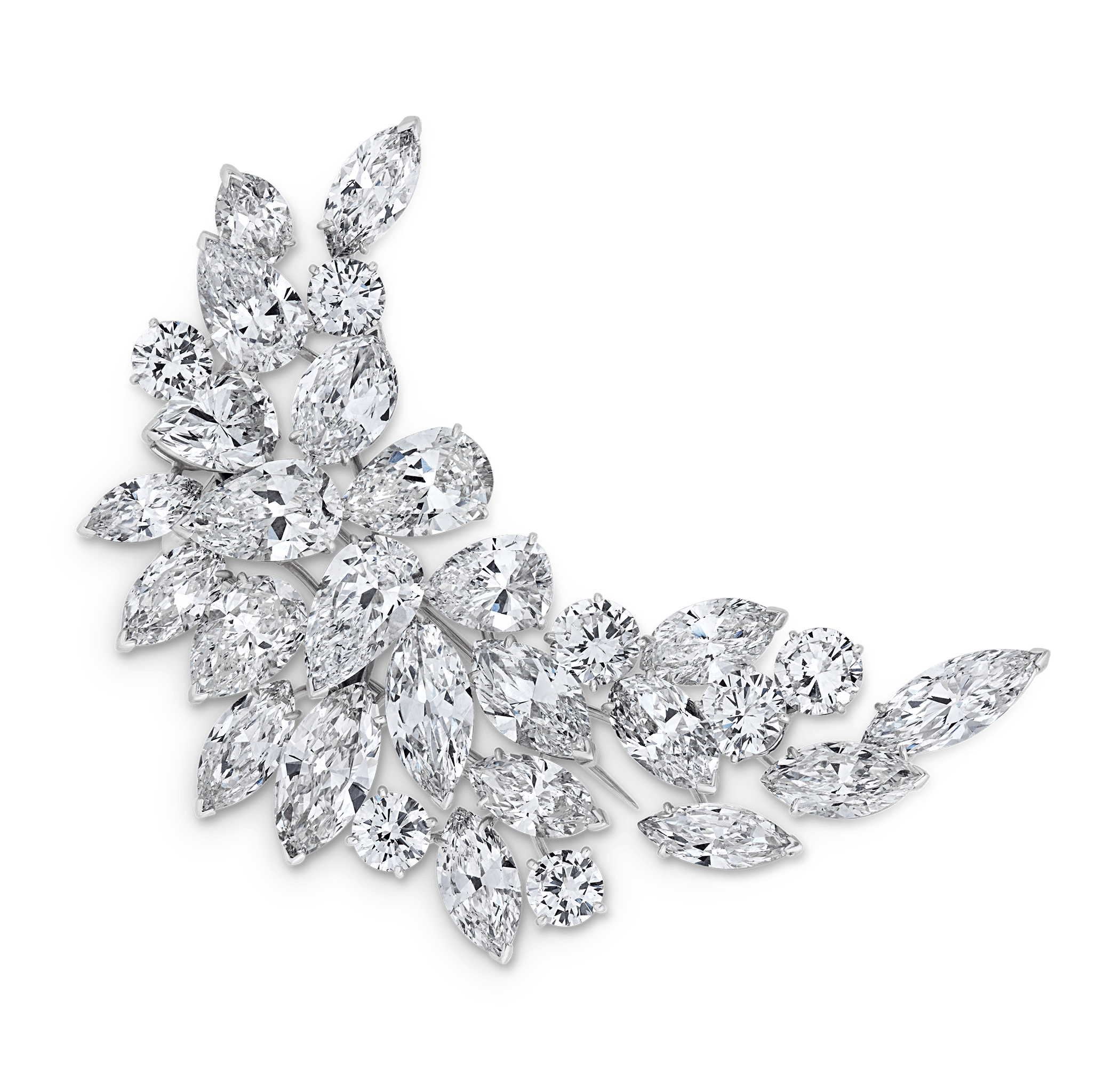 The brooch pairs seven pear shaped diamonds totaling 13.80 carats, sixteen marquise cut diamonds totaling 20.17 carats and seven round brilliant diamonds totaling 5.41 carats. Every stone is graded D–F in color, representing the top tier of color grading. Artfully set en tremblant, the exceptional diamonds respond to movement with a captivating shimmer, enhancing the crescent, foliate-inspired composition with dazzling life and brilliance. Set in platinum.