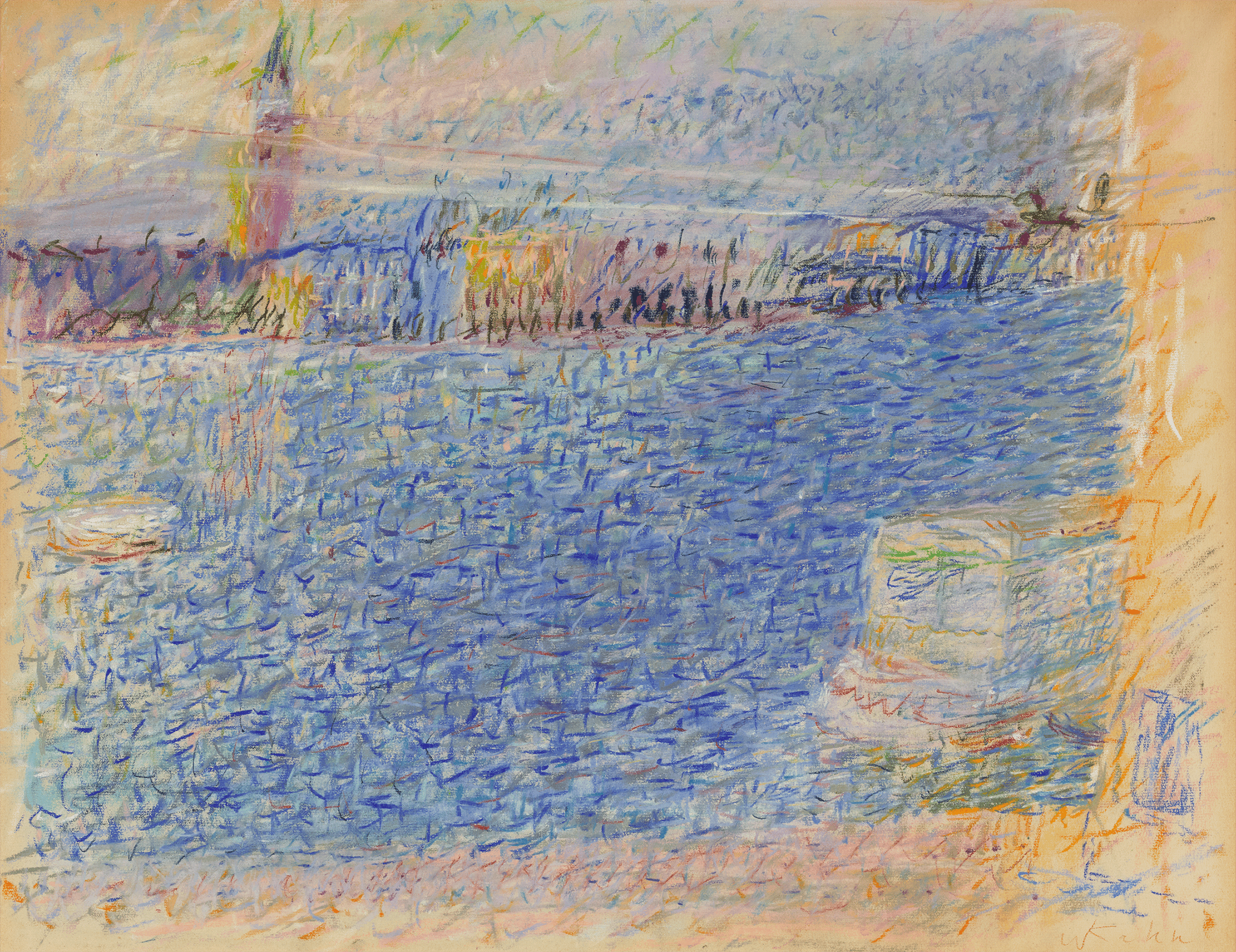 Rendered from his studio overlooking the Grand Canal, this pastel depicts the city’s iconic waterway through a modernist lens. While the famed bell tower of St. Mark’s and a passing ferry anchor the scene, Kahn creates a vibrant flurry of light and motion with his energetic linework and radiant palette. Layers of pastel imbue the scene with an atmospheric “fog” effect that would later define his mature style. The work’s shimmering hues—at once spontaneous and deliberate—reflect Kahn’s poetic quest to convey the sensation of freedom within landscape.