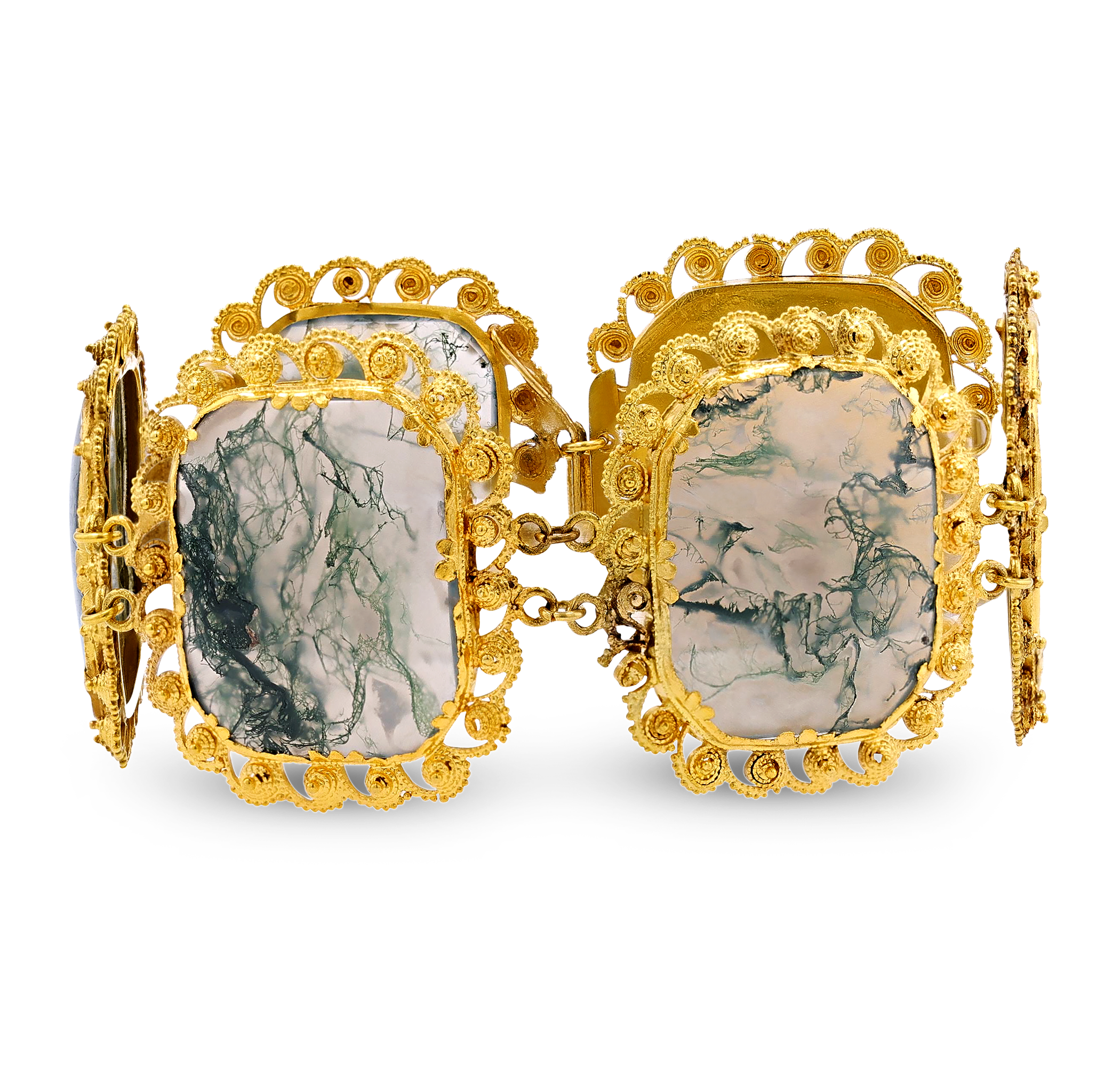 - This Victorian bracelet features multiple large moss agate panels set in gold
