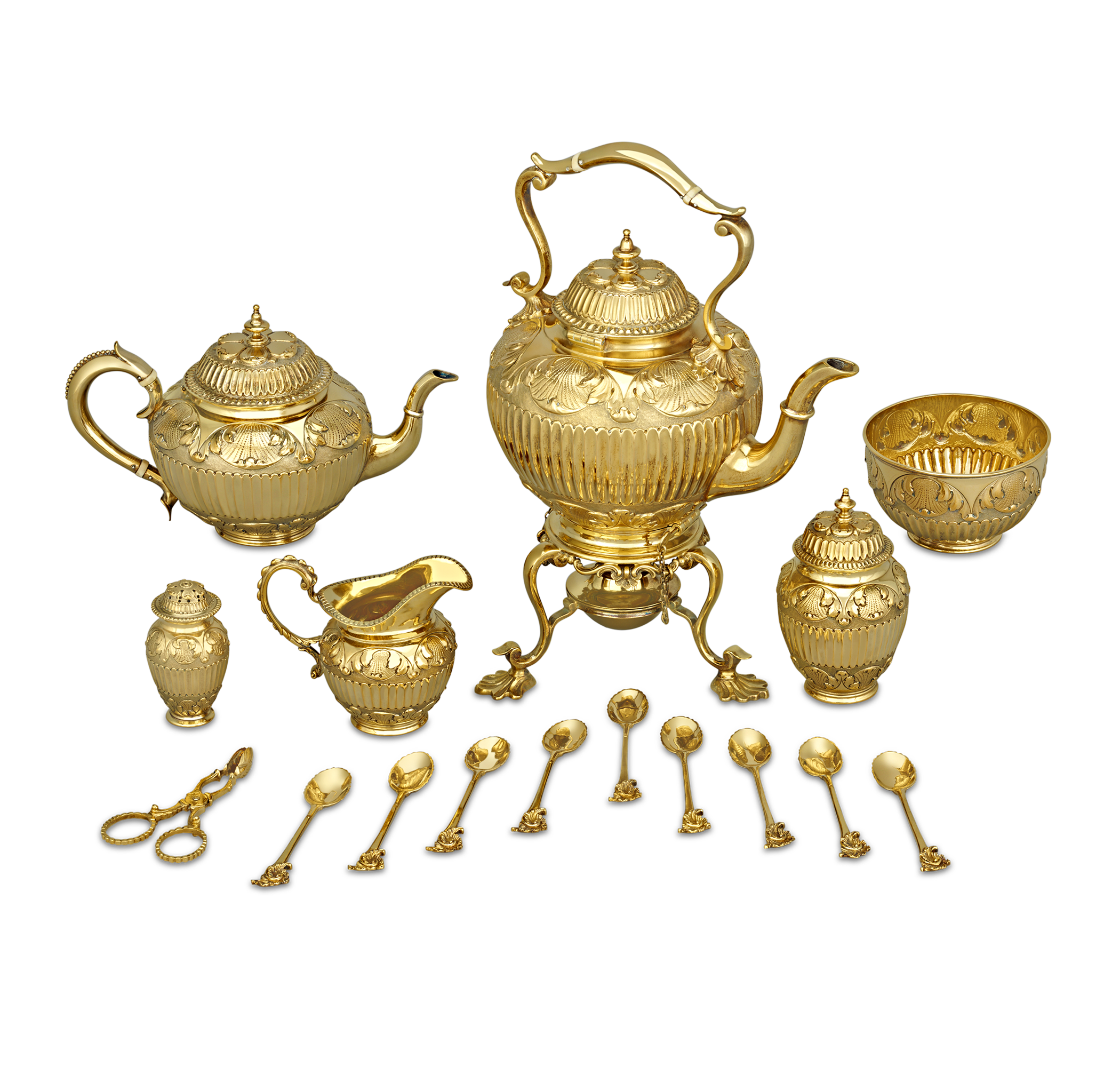 This dazzling silver-gilt tea set by Edward Barnard & Sons embodies the opulence and craftsmanship of Victorian silverware. The 16-piece set includes a tea kettle on a stand, a teapot, a castor, a creamer, a covered sugar jar, an open bowl, sugar tongs and nine matching teaspoons. Gilded to perfection, the set exemplifies the Victorian era's emphasis on intricate designs and elegant. . .