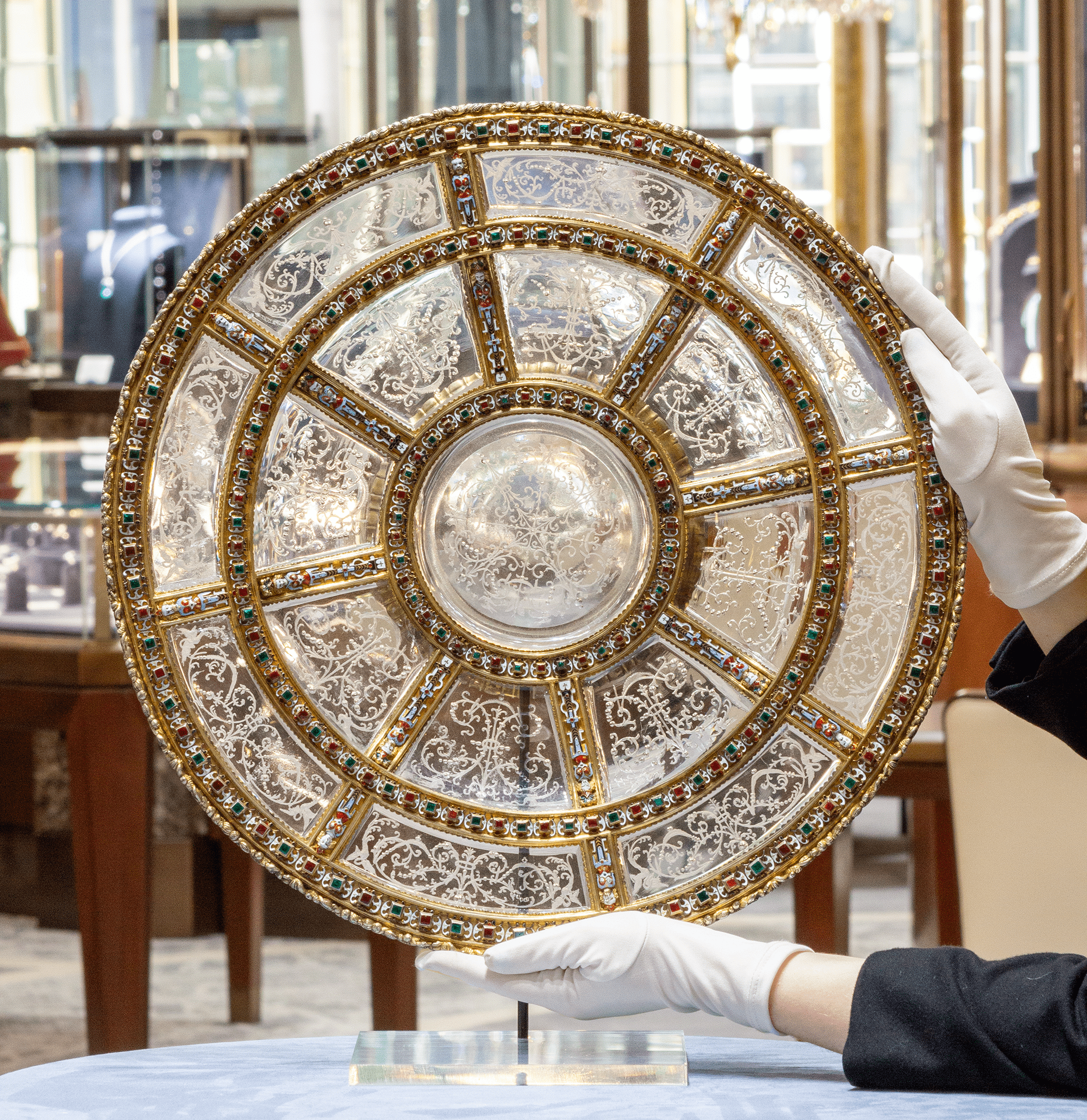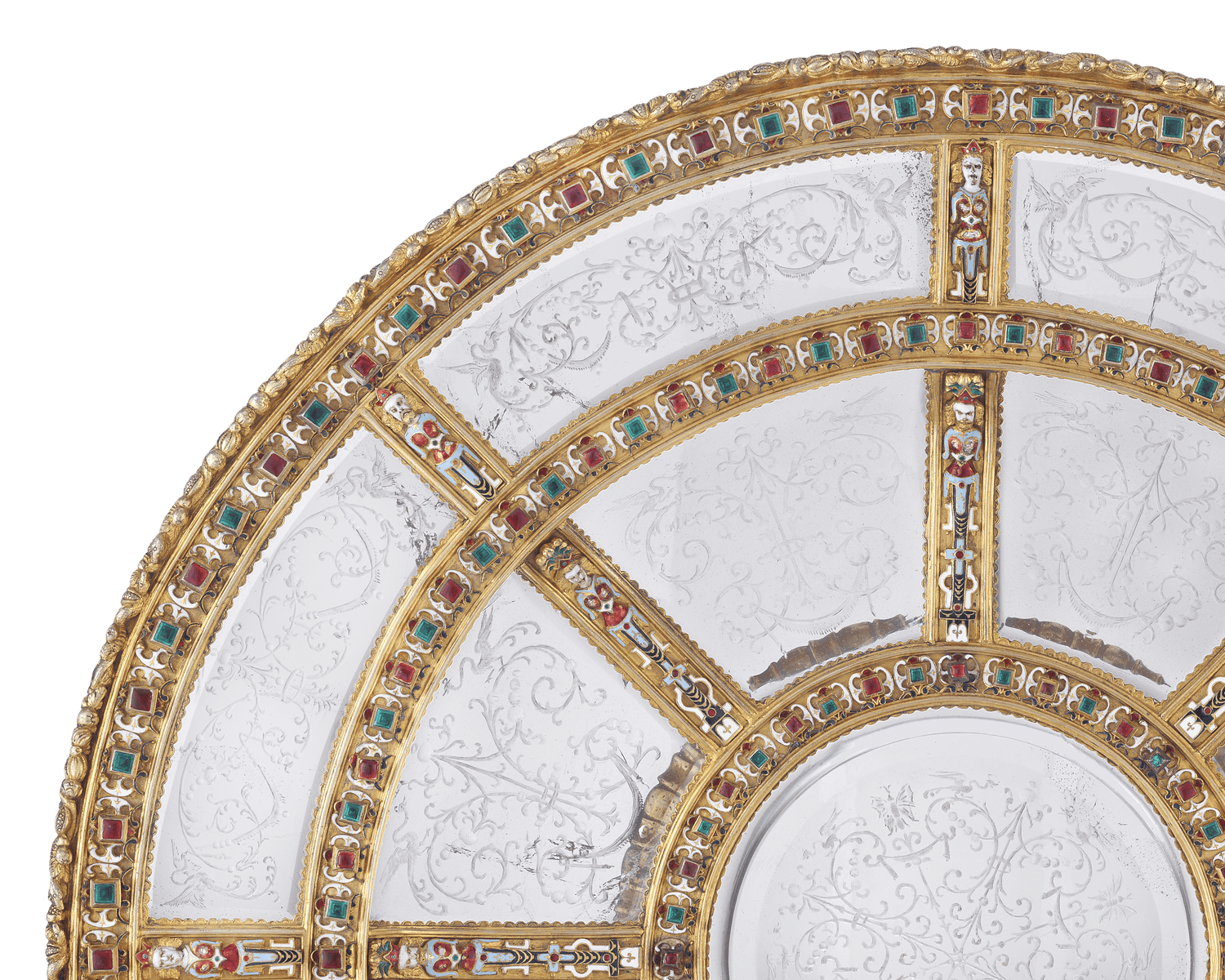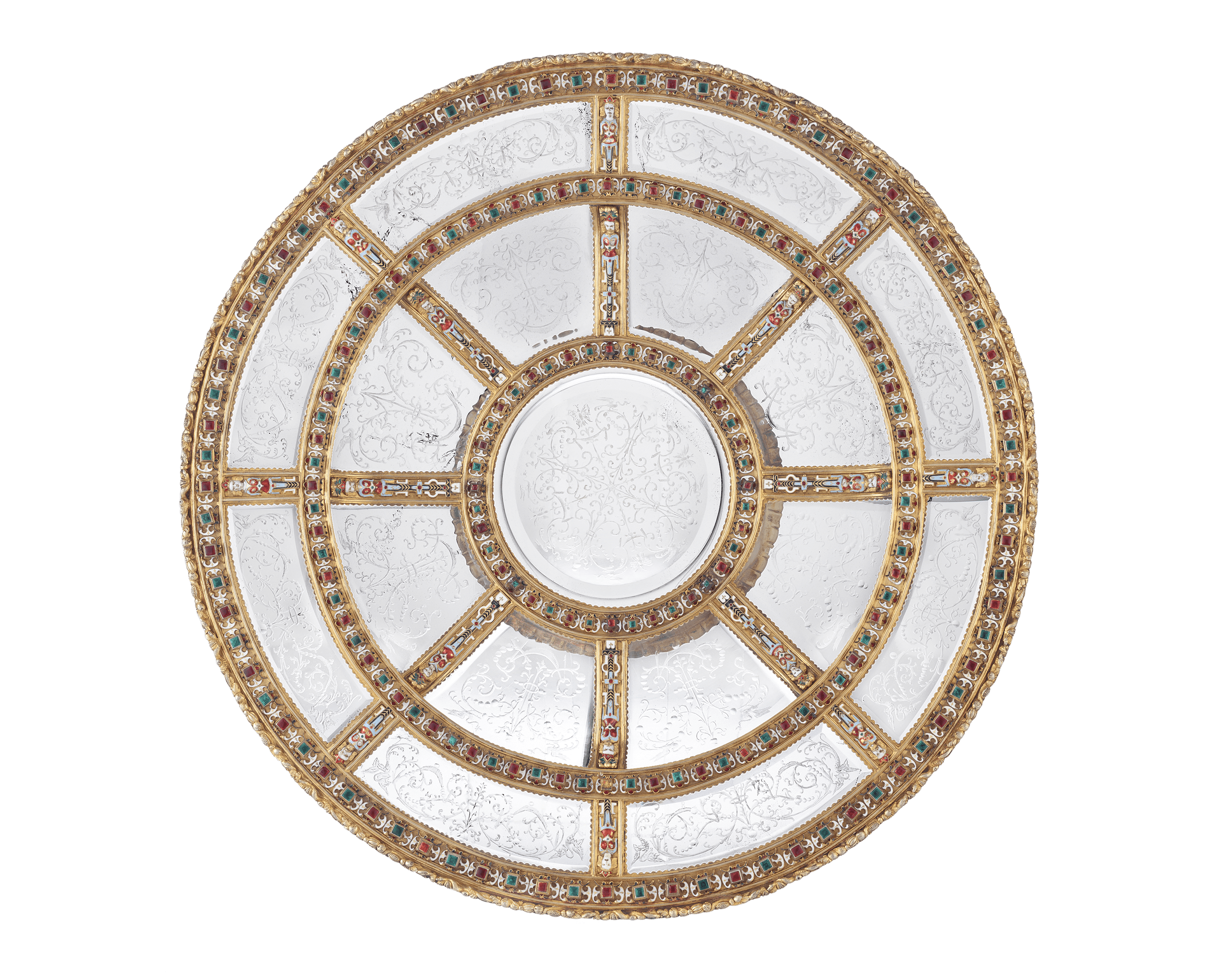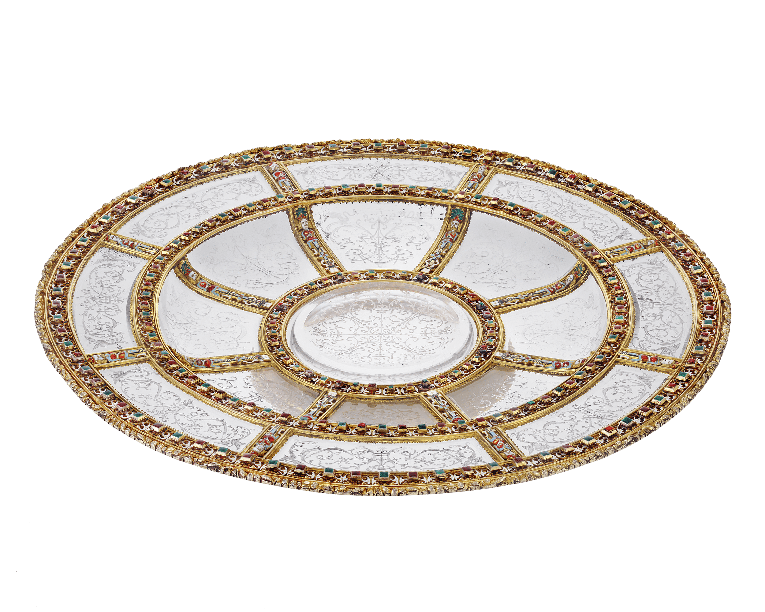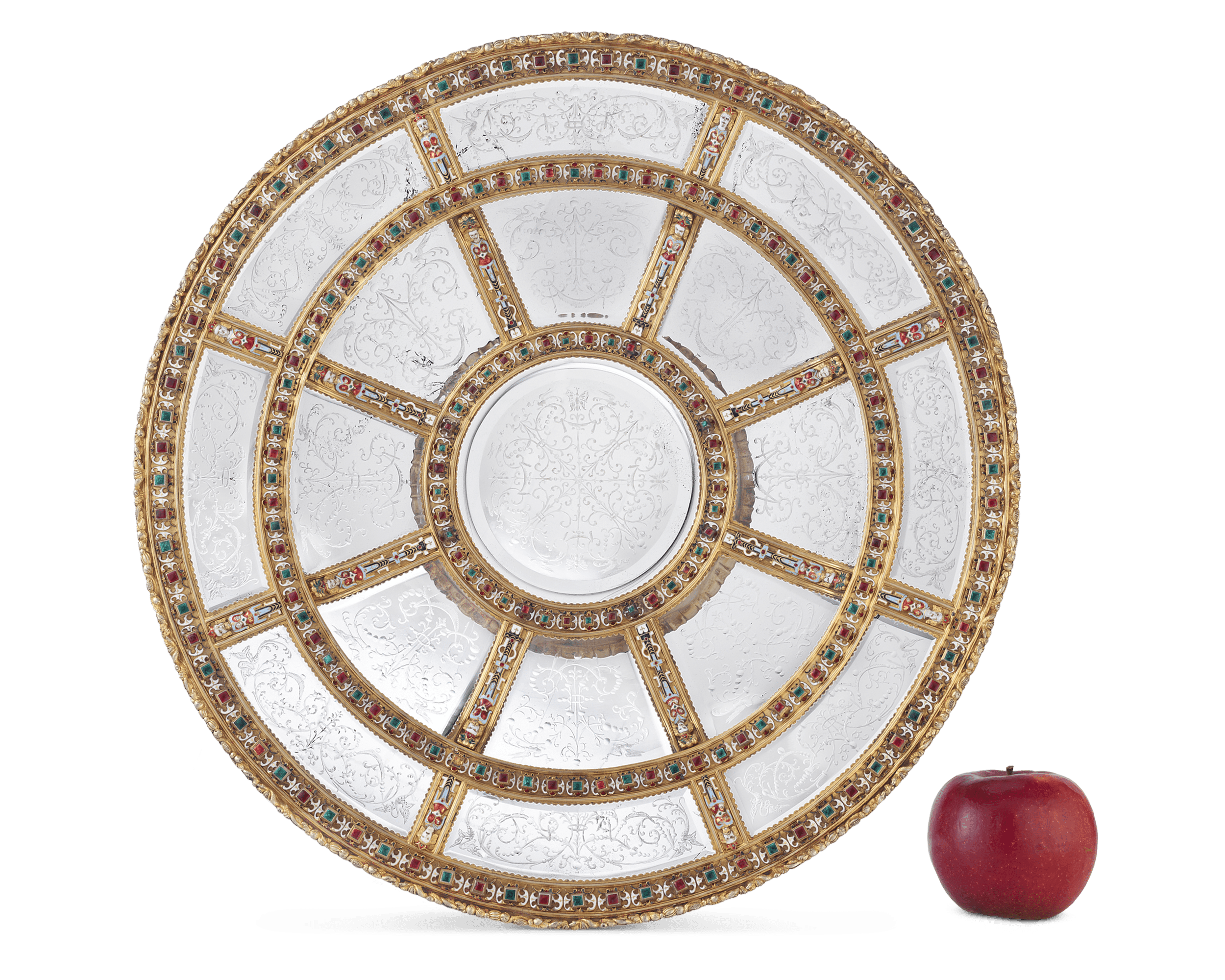 - Seventeen intricately etched rock crystal panels are set in this Viennese charger