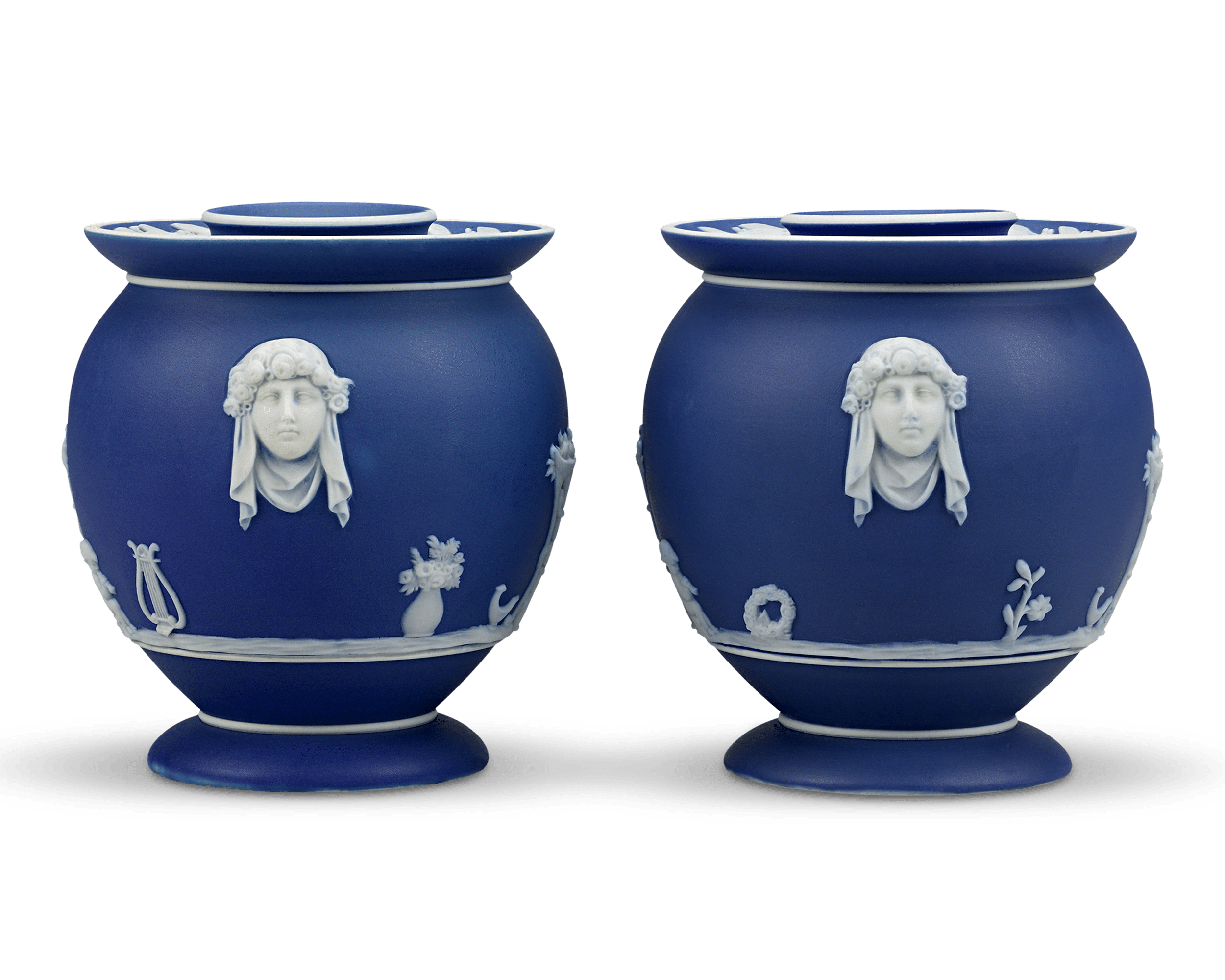 Timeless and elegant, this pair of Wedgwood fumigator jars is crafted of the firm’s signature jasperware. This pair of vessels showcases a striking deep blue hue, contrasting greatly with the classical figures rendered in relief on their surface. Featuring Grecian lyres, flute-playing cherubs and distinctive maidenheads, the stunning 19th-century jars epitomize the celebrated aesthetics of Wedgwood.